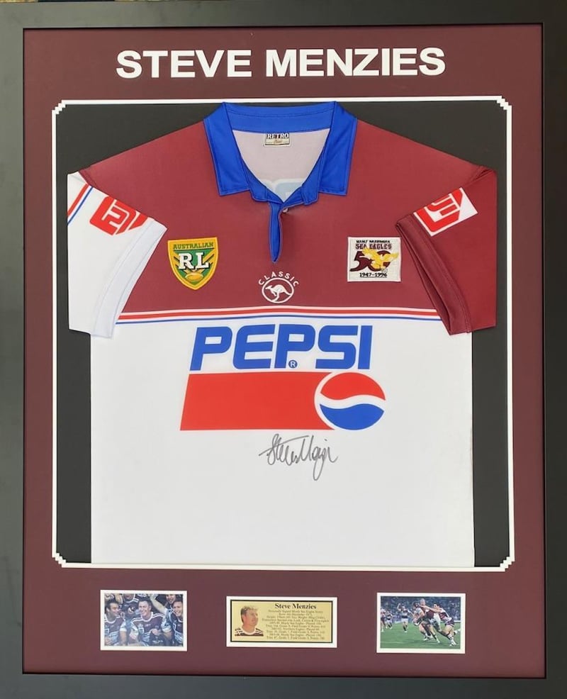 STEVE MENZIES PERSONLLY SIGNED MANLY WARRINGAH SEA EAGLES JERSEY Framed Using Double Mats, 2 Unsigned Photographs And A Plaque. Hand Signed By Steve Menzies Using A Black MarkerAccompanied By A Certificate Of AuthenticityCondition: Good - Refer Images498066+27