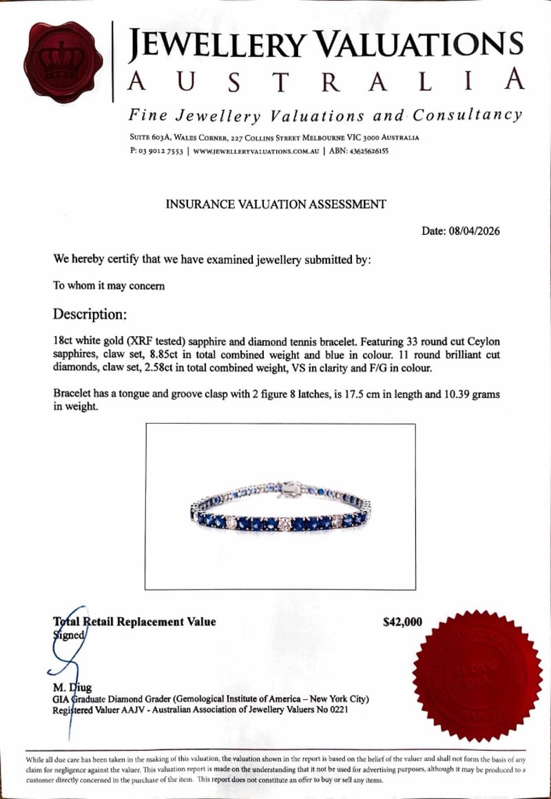 18CT WHITE GOLD (XRF TESTED) SAPPHIRE AND DIAMOND TENNIS BRACELETFeaturing 33 Round Cut Ceylon Sapphires, Claw Set, 8.85Ct In Total Combined Weight And Blue In Colour. 11 Round Brilliant Cut Diamonds, Claw Set, 2.58Ct In Total Combined Weight, Vs In Clarity And F/G In Colour.Bracelet Has A Tongue And Groove Clasp With 2 Figure 8 Latches, Is 17.5 Cm In Length And 10.39 Grams In Weight.Condition: Good - Refer To ImagesThis valuation has been conducted by an independent third-party professional. The valuation amount is an assessment by the issuing valuer and does not reflect the auction value of the item.Any inquiries regarding the valuation should be directed to the issuing valuer (refer to contact details on the certificate), as Lloyds Auctions has no affiliation or influence over the valuation, the valuer, or the stated amount.Insurance Replacement Valuation Amount: $42,000.00163136+4