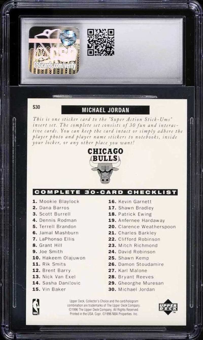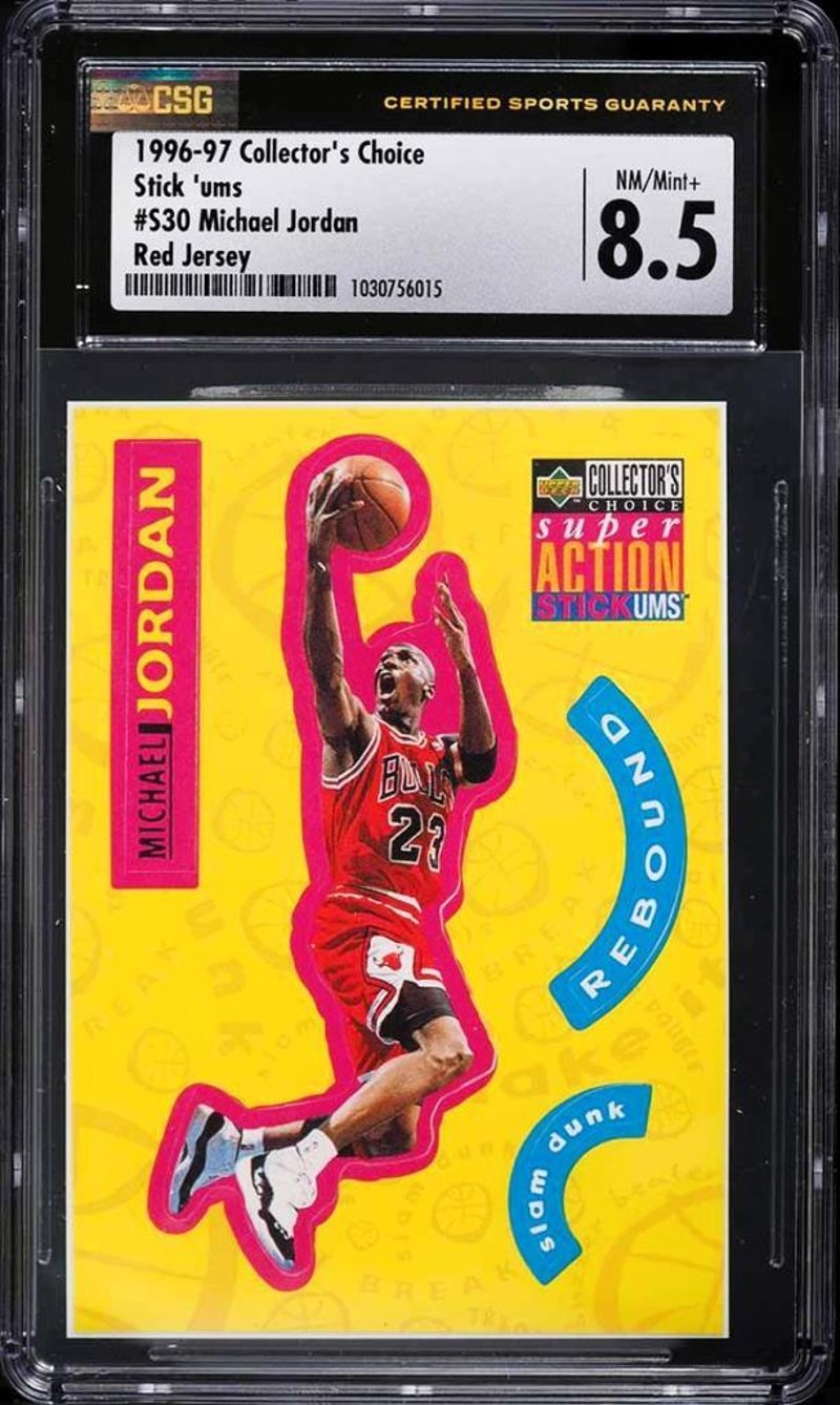 A 1996 Collector'S Choice Stick-Ums “Red Jersey” Card Of Michael Jordan, Card #S30. Authenticated And Graded By Csg. This Distinctive Insert-Style Issue Stands Out For Its Unique Format And Enduring Appeal Among Jordan Collectors.