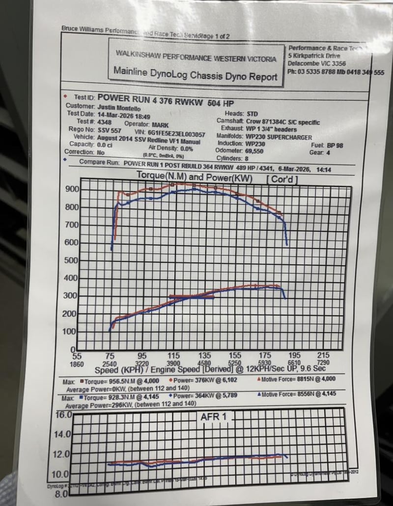 This is not just a VF Redline with a few stickers on it. This is a genuine Walkinshaw Racing Limited Edition, complete with the signed build plaque featuring the four 2014 Holden Racing Team drivers: Garth Tander, James Courtney, Tim Slade and Nick Percat. The Walkinshaw package goes well beyond cosmetics. Under the bonnet sits the factory 6.0-litre V8 fitted with a Walkinshaw/Harrop supercharger kit, certified by a Queensland modification plate and backed by a clutch rebuild performed by Walkinshaw Performance themselves. Paired with the Tremec 6-speed manual, this is one of the more serious VF packages you will find at auction. The Walkinshaw engine rebuild alone amounts to approximately $18,000, further highlighting the level of investment and performance pedigree behind this example