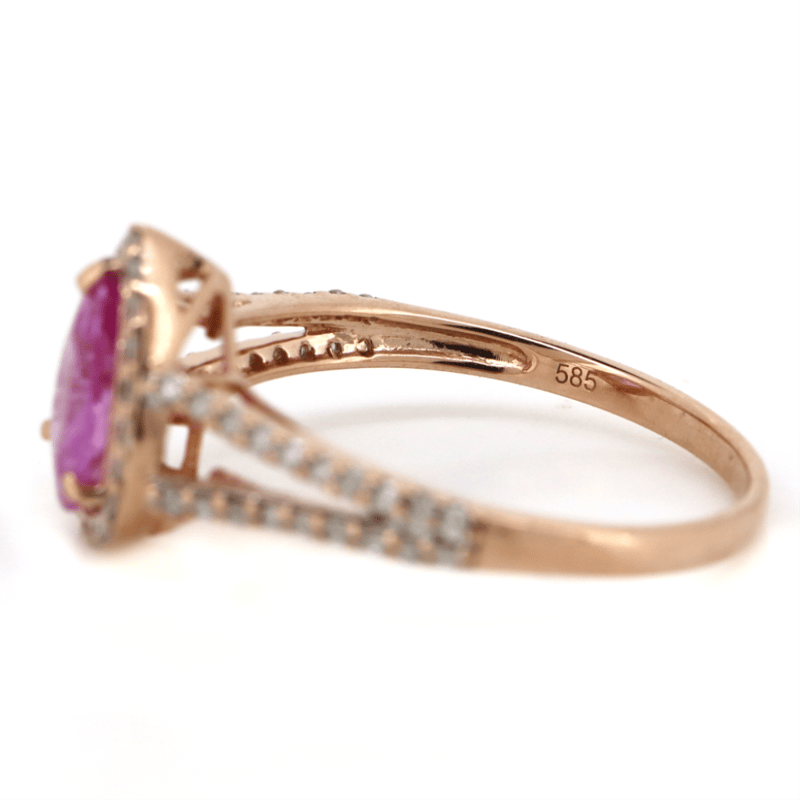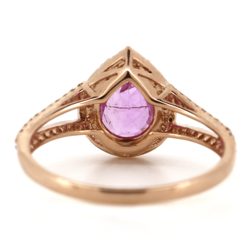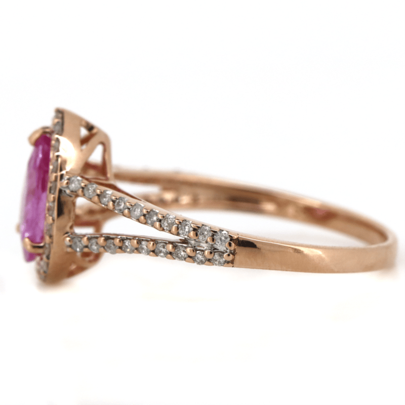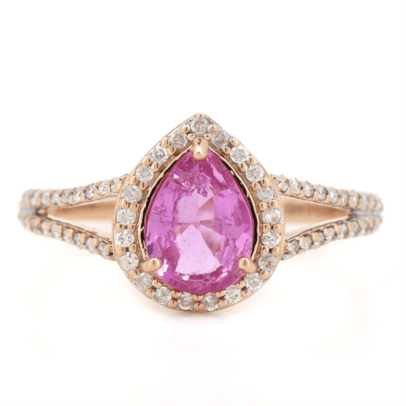 14K ROSE GOLD, PINK SAPPHIRE AND DIAMOND, HALO SPLIT BAND RING. The Centre Features, One Pear Cut, Pink Sapphire (1.02Ct, Moderate Eye Visible Inclusions), Claw Set. Surrounding The Centre In A Halo And Decorating The Band Are, 59 Round Brilliant Cut, Diamonds (0.23Ct Tdw, J-K Colour, Si2-I2 Clarity), Micro-Claw Set In Rhodium Plating. Ring Size N 1/2. Valuations Provided by an Independent Third-Party Professional Not Directly Associated With Lloyds Auctions at AUD $$9,200.00This valuation has been conducted by an independent third-party professional. The valuation amount is an assessment by the issuing valuer and does not reflect the auction value of the item. Any inquiries regarding the valuation should be directed to the issuing valuer (refer to contact details on the certificate), as Lloyds Auctions has no affiliation or influence over the valuation, the valuer, or the stated amount. Condition: Good - Refer Images 0645986+1410