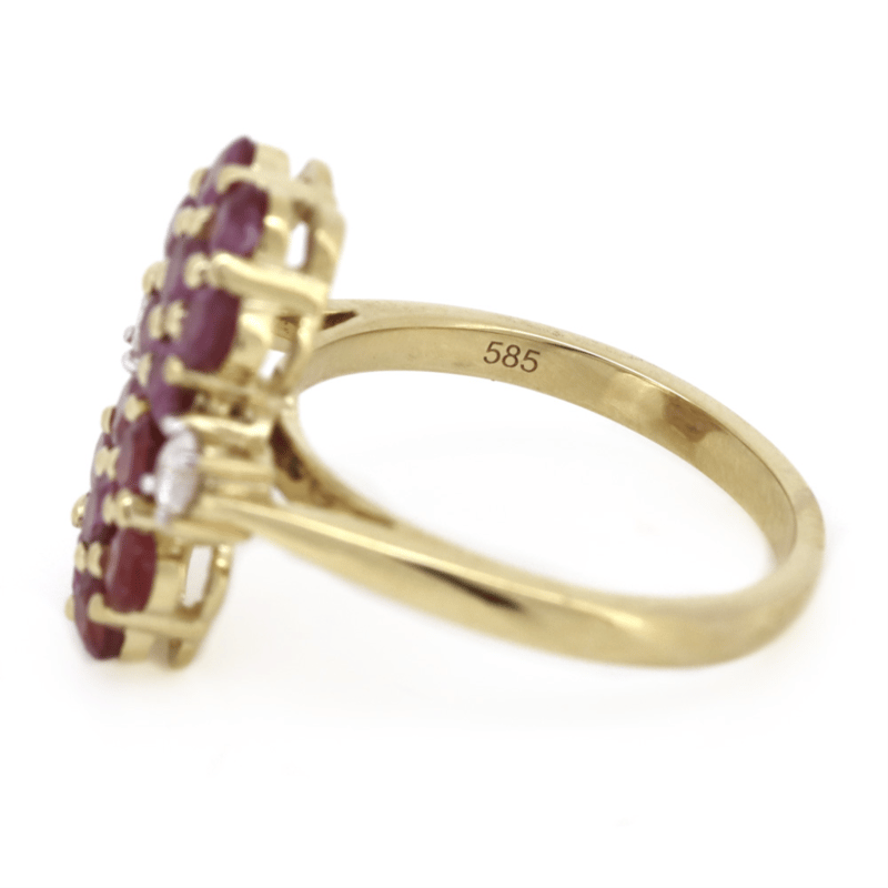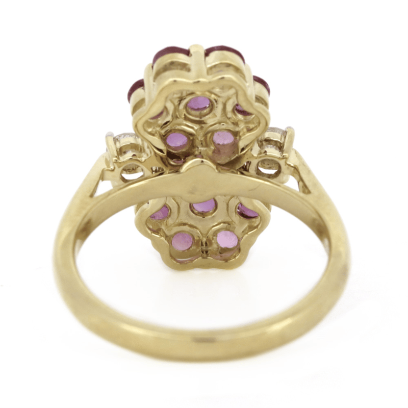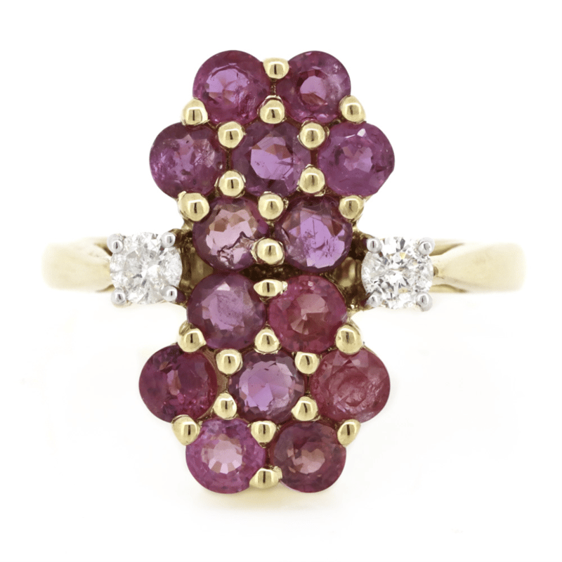14K YELLOW GOLD, PINK SAPPHIRE AND DIAMOND, FLORAL RING. The Design Features, 14 Round Cut, Dark Purplish-Pink, Sapphires (2.16Ct Tsw, Light-Moderate Inclusions), Bead Set In Two Flower Designs. Accompanied By, 2 Round Brilliant Cut, Diamonds (0.165Ct Tdw, G-H Colour, Si-I2 Clarity), 4 Claw Set. Ring Size K 1/2. Valuations Provided by an Independent Third-Party Professional Not Directly Associated With Lloyds Auctions at AUD $$11,400.00This valuation has been conducted by an independent third-party professional. The valuation amount is an assessment by the issuing valuer and does not reflect the auction value of the item. Any inquiries regarding the valuation should be directed to the issuing valuer (refer to contact details on the certificate), as Lloyds Auctions has no affiliation or influence over the valuation, the valuer, or the stated amount. Condition: Good - Refer Images 0645986+1411