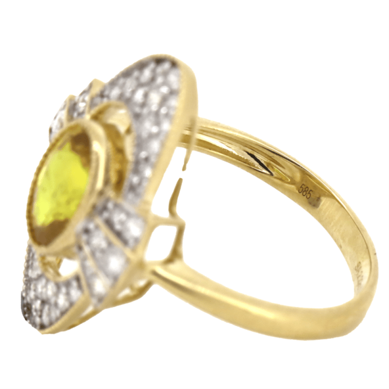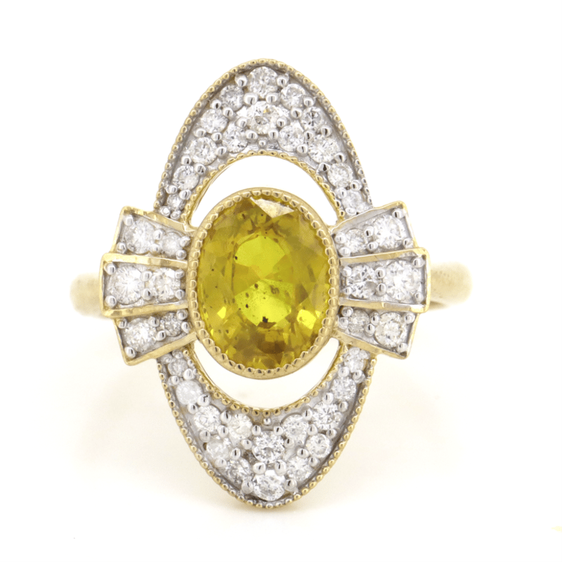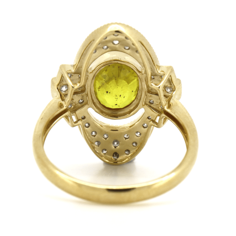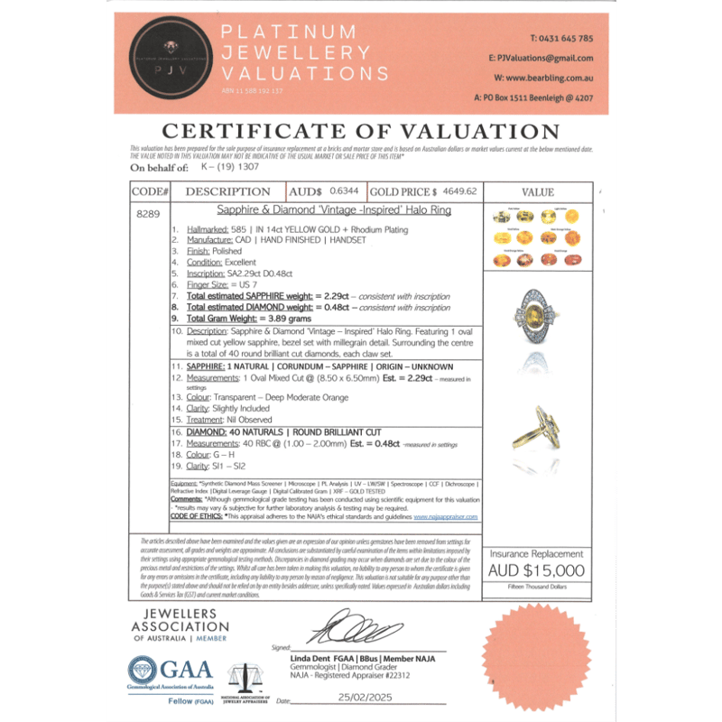 14K YELLOW GOLD, YELLOW SAPPHIRE AND DIAMOND, VINTAGE INSPIRED RING. The Centre Features, One Oval Mixed Cut, Deep Moderate Yellow-Orange, Sapphire (2.29Ct, Slightly Included), Bezel Set With Millegrain Detail. Surrounding The Centre Are, 40 Round Brilliant Cut, Diamonds (0.48Ct Tdw, G-H Colour, Si1-Si2 Clarity), Claw Set. Ring Size N 1/2. Valuations Provided by an Independent Third-Party Professional Not Directly Associated With Lloyds Auctions at AUD $$15,000.00This valuation has been conducted by an independent third-party professional. The valuation amount is an assessment by the issuing valuer and does not reflect the auction value of the item. Any inquiries regarding the valuation should be directed to the issuing valuer (refer to contact details on the certificate), as Lloyds Auctions has no affiliation or influence over the valuation, the valuer, or the stated amount. Condition: Good - Refer Images 0645986+1419