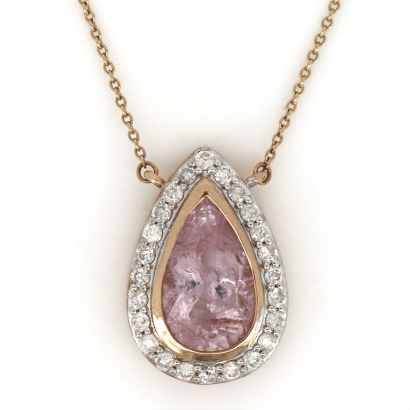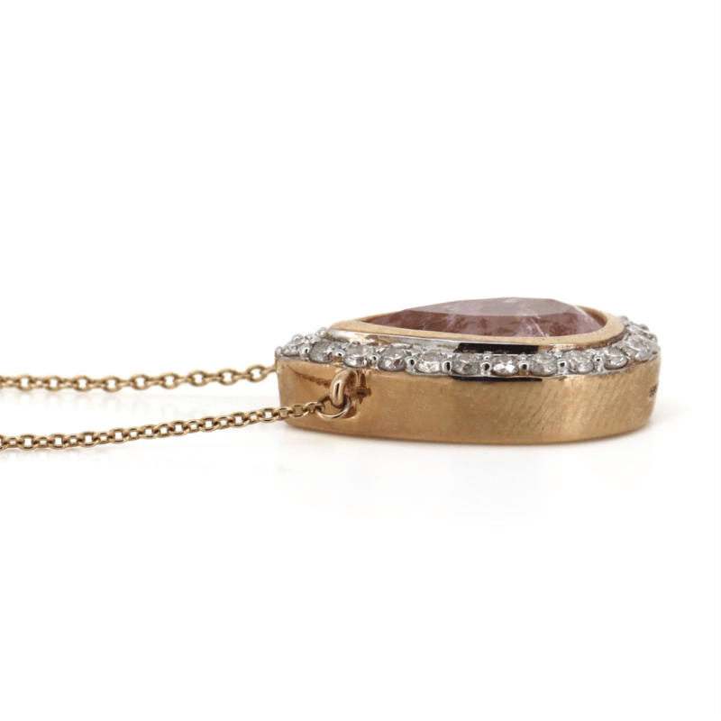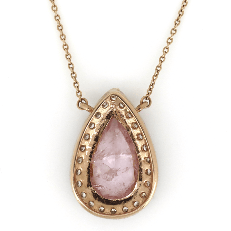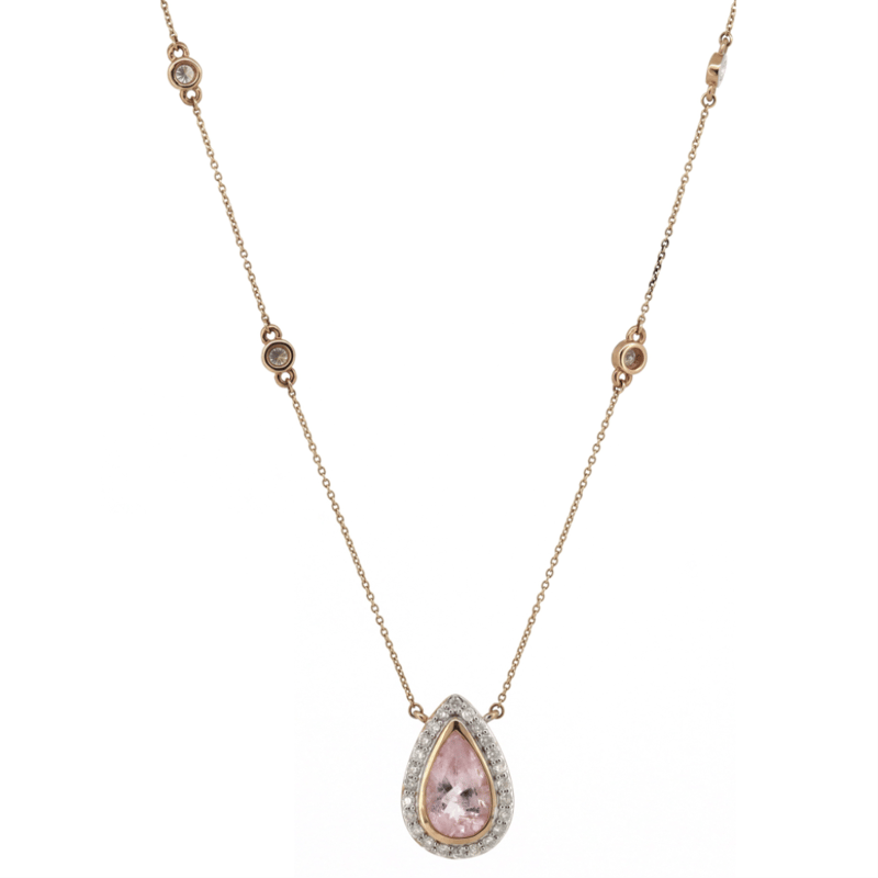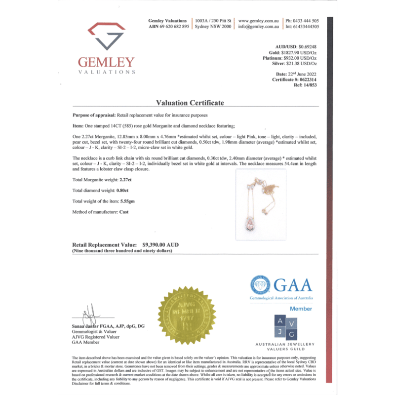 14K ROSE GOLD, MORGANITE AND DIAMOND, NECKLACE. The Necklace Features, One Pear Cut, Light Pink, Morganite (2.27Ct, Included), Bezel Set. Surrounding The Stone In A Halo And Decorating The Chain Are, 30 Round Brilliant Cut, Diamonds (0.80Ct Tdw, J-K Colour, Si2-I2 Clarity), Micro-Claw/Bezel Set In White Gold. The Necklace Has A Lobster Claw Clasp. Chain Length Is 55Cm (Adjustable). Valuations Provided by an Independent Third-Party Professional Not Directly Associated With Lloyds Auctions at AUD $$9,390.00This valuation has been conducted by an independent third-party professional. The valuation amount is an assessment by the issuing valuer and does not reflect the auction value of the item. Any inquiries regarding the valuation should be directed to the issuing valuer (refer to contact details on the certificate), as Lloyds Auctions has no affiliation or influence over the valuation, the valuer, or the stated amount. Condition: Good - Refer Images 0645986+1421