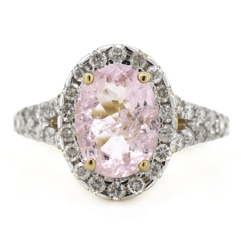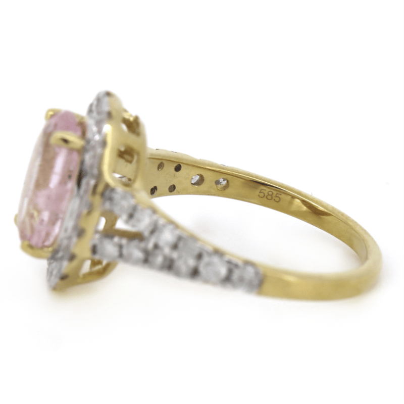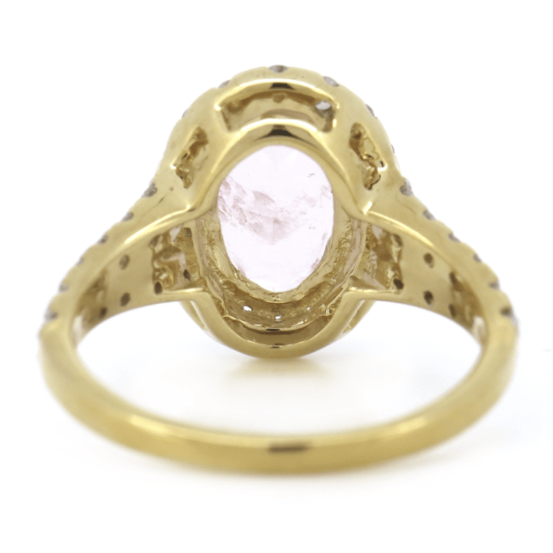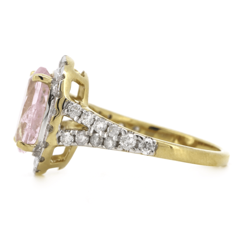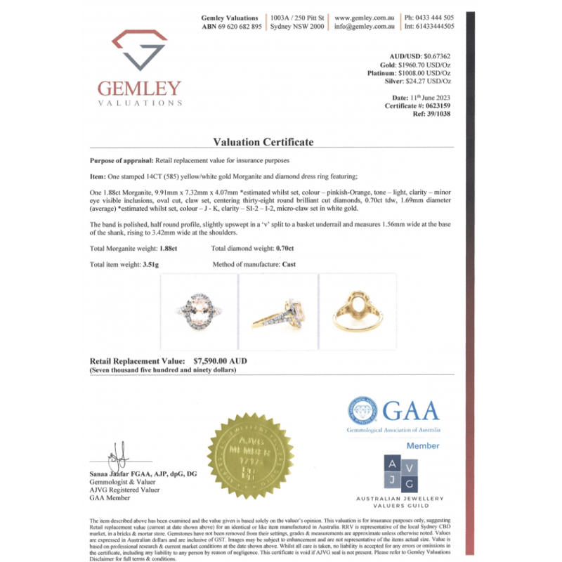 14K YELLOW GOLD, MORGANITE AND DIAMOND, HALO SPLIT BAND RING. The Centre Features, One Oval Cut, Light Pinkish-Orange, Morganite (1.88Ct, Minor Eye Visible Inclusions), 4 Claw Set. Surrounding The Centre In A Halo And Decorating The Band Are, 38 Round Brilliant Cut, Diamonds (0.70Ct Tdw, J-K Colour, Si2-I2 Clarity), Micro-Claw Set In White Gold. Ring Size L 1/2. Valuations Provided by an Independent Third-Party Professional Not Directly Associated With Lloyds Auctions at AUD $$7,590.00This valuation has been conducted by an independent third-party professional. The valuation amount is an assessment by the issuing valuer and does not reflect the auction value of the item. Any inquiries regarding the valuation should be directed to the issuing valuer (refer to contact details on the certificate), as Lloyds Auctions has no affiliation or influence over the valuation, the valuer, or the stated amount. Condition: Good - Refer Images 0645986+1422