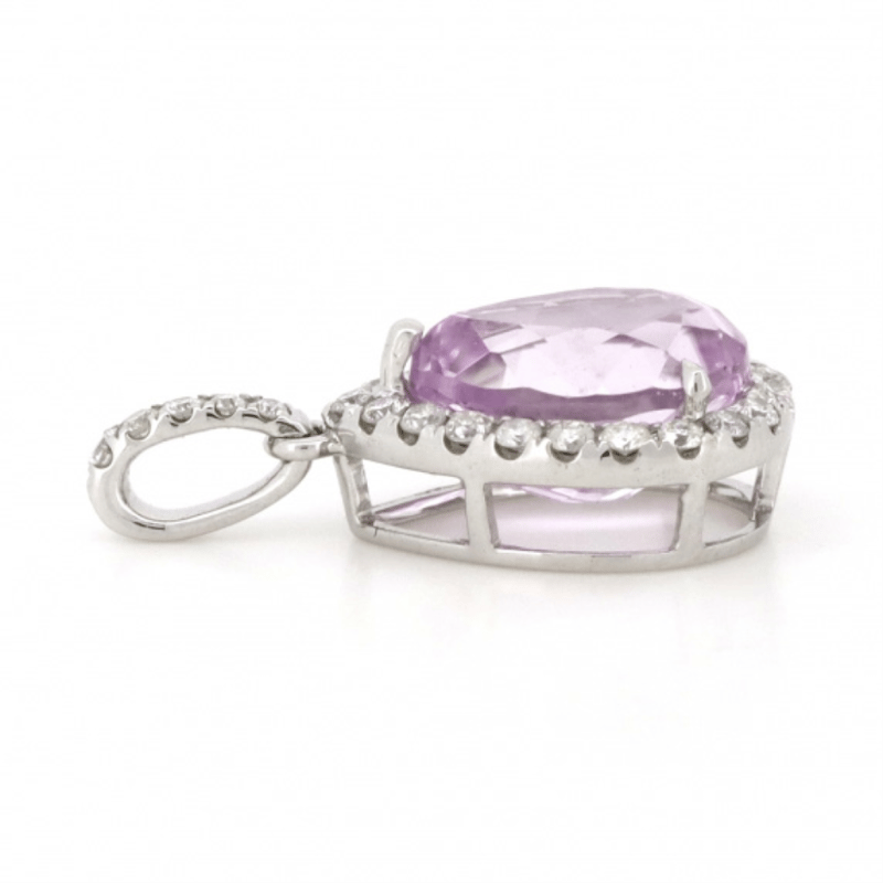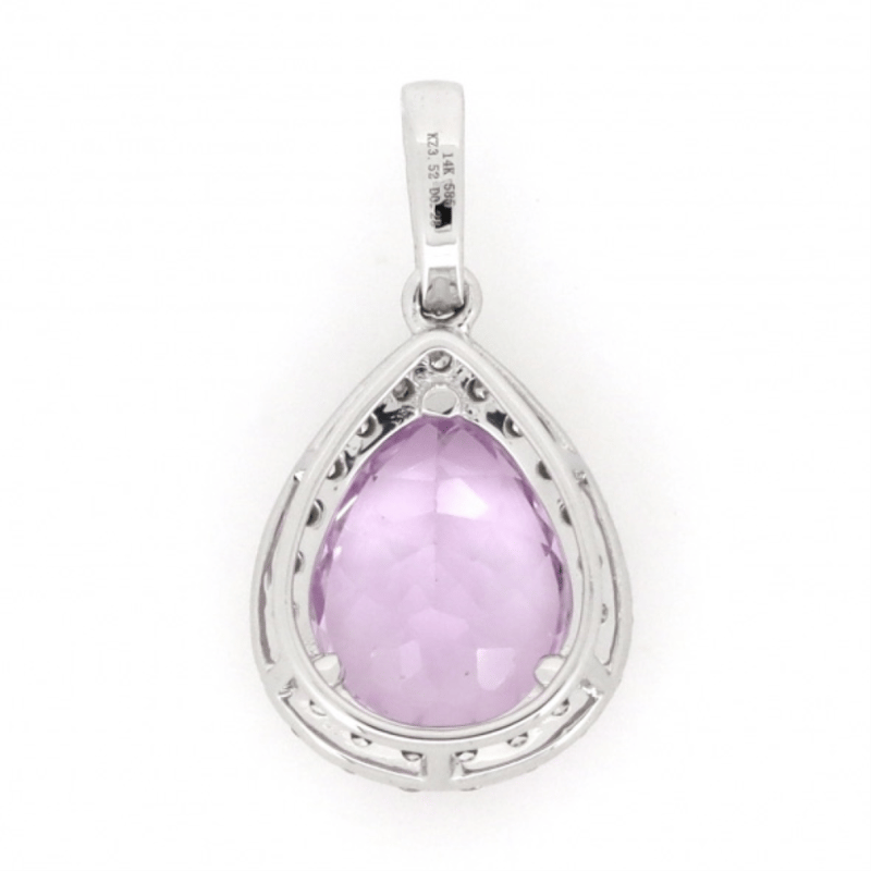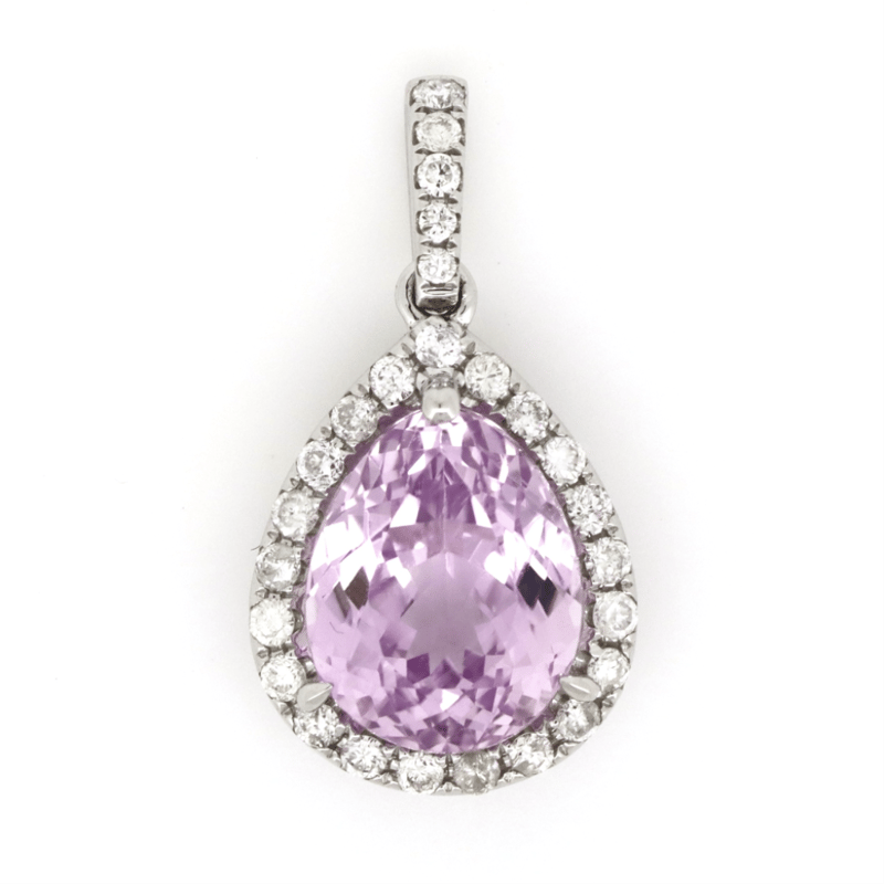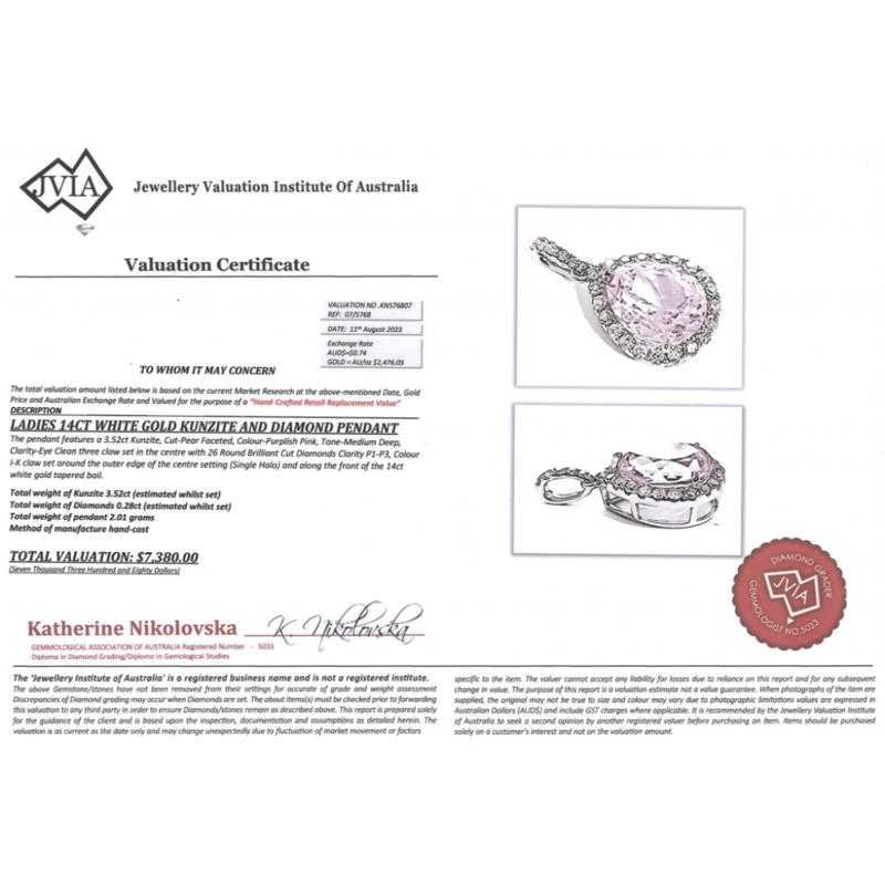 14K WHITE GOLD, KUNZITE AND DIAMOND, HALO PENDANT. The Centre Features, One Pear Faceted Cut, Purplish-Pink, Kunzite (3.52Ct, Eye Clean Clarity), 3 Claw Set. Surrounding The Centre In A Halo And Decorating The Bail Are, 26 Round Brilliant Cut, Diamonds (0.28Ct Tdw, I-K Colour, P1-P3 Clarity), Claw Set. Valuations Provided by an Independent Third-Party Professional Not Directly Associated With Lloyds Auctions at AUD $$7,380.00This valuation has been conducted by an independent third-party professional. The valuation amount is an assessment by the issuing valuer and does not reflect the auction value of the item. Any inquiries regarding the valuation should be directed to the issuing valuer (refer to contact details on the certificate), as Lloyds Auctions has no affiliation or influence over the valuation, the valuer, or the stated amount. Condition: Good - Refer Images 0645986+1423