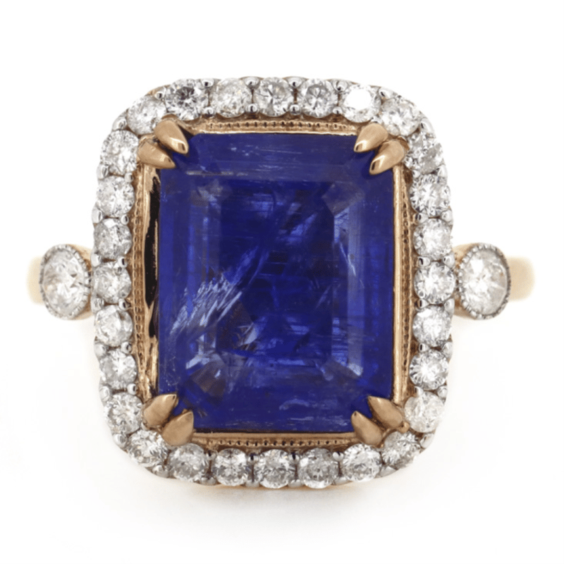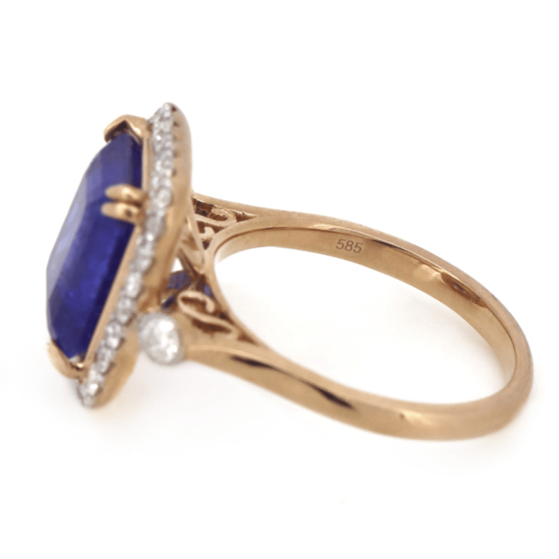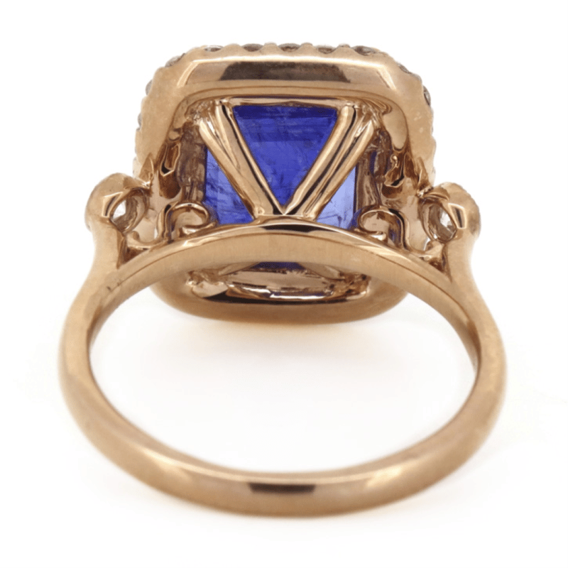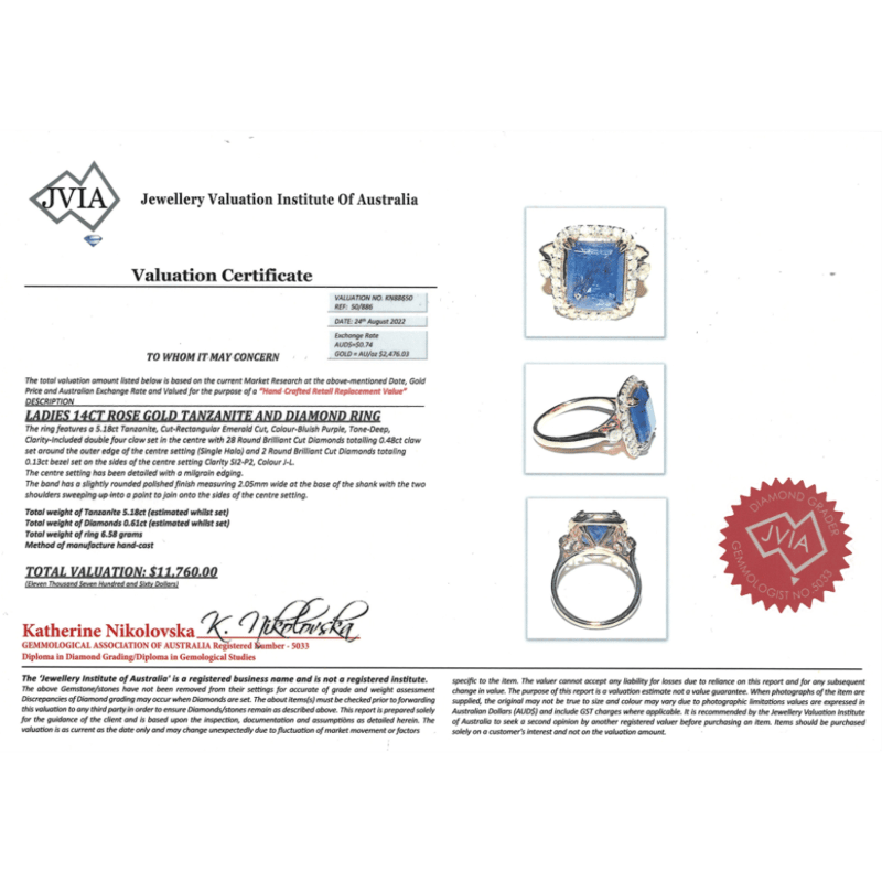 14K ROSE GOLD, TANZANITE AND DIAMOND, HALO RING. The Centre Features, One Emerald Cut, Deep Bluish-Purple, Tanzanite (5.18Ct, Included), Double Claw Set. Surrounding The Centre In A Halo And Flanking Either Side Are, 30 Round Brilliant Cut, Diamonds (0.61Ct Tdw, J-L Colour, Si2-P2 Clarity), Grain Set. Ring Size N. Valuations Provided by an Independent Third-Party Professional Not Directly Associated With Lloyds Auctions at AUD $$11,760.00This valuation has been conducted by an independent third-party professional. The valuation amount is an assessment by the issuing valuer and does not reflect the auction value of the item. Any inquiries regarding the valuation should be directed to the issuing valuer (refer to contact details on the certificate), as Lloyds Auctions has no affiliation or influence over the valuation, the valuer, or the stated amount. Condition: Good - Refer Images 0645986+1425