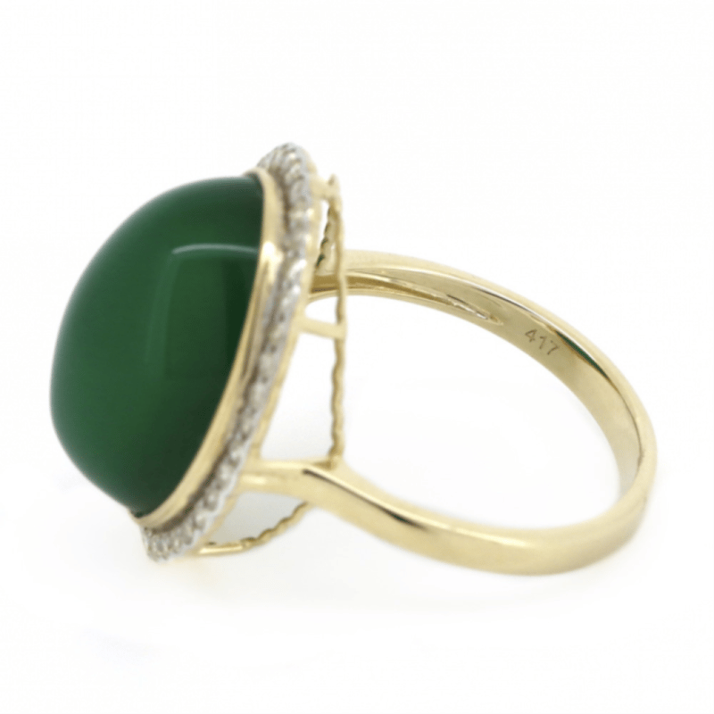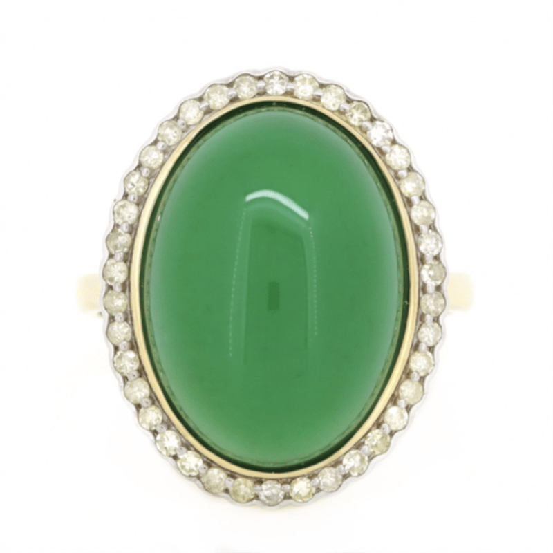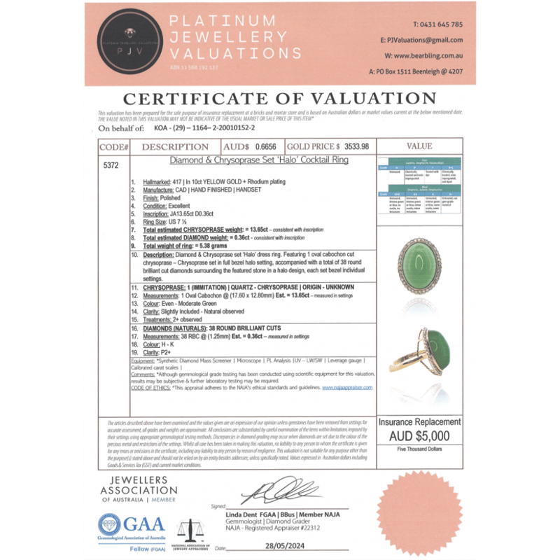 10K YELLOW GOLD, 13.65CT GREEN CHRYSOPRASE AND DIAMOND, STATEMENT RING. The Centre Features, One Oval Cabochon Cut, Even-Moderate Green, Chrysoprase (13.65Ct, Slightly Included, Enhanced), Bezel Set. Surrounding The Centre In A Halo Are, 38 Round Brilliant Cut, Diamonds (0.36Ct Tdw, H-K Colour, P2+ Clarity), Bezel Set. Ring Size O 1/2. Valuations Provided by an Independent Third-Party Professional Not Directly Associated With Lloyds Auctions at AUD $$5,000.00This valuation has been conducted by an independent third-party professional. The valuation amount is an assessment by the issuing valuer and does not reflect the auction value of the item. Any inquiries regarding the valuation should be directed to the issuing valuer (refer to contact details on the certificate), as Lloyds Auctions has no affiliation or influence over the valuation, the valuer, or the stated amount. Condition: Good - Refer Images 0645986+1429