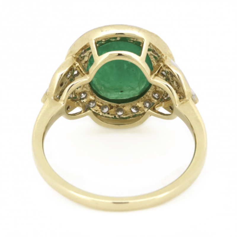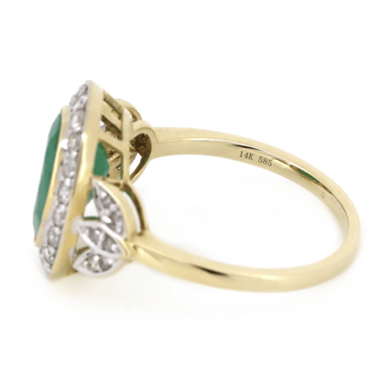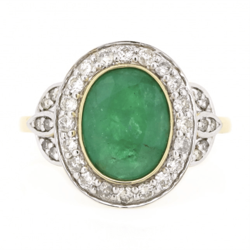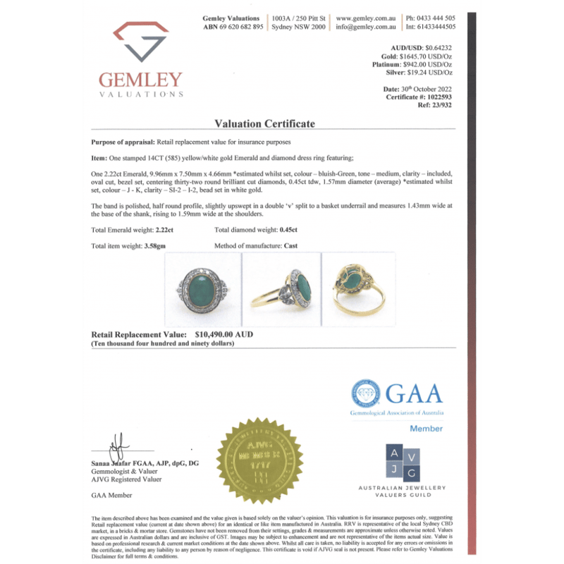 14K YELLOW GOLD, EMERALD AND DIAMOND, HALO RING. The Centre Features, One Oval Cut, Medium Bluish Green, Emerald (2.22Ct, Included), Bezel Set. Surrounding The Centre In A Halo And Decorating The Shoulders Are, 32 Round Brilliant Cut, Diamonds (0.45Ct Tdw, J-K Colour, Si2-I2 Clarity), Bead Set In White Gold. Ring Size M 1/2. Valuations Provided by an Independent Third-Party Professional Not Directly Associated With Lloyds Auctions at AUD $$10,490.00This valuation has been conducted by an independent third-party professional. The valuation amount is an assessment by the issuing valuer and does not reflect the auction value of the item. Any inquiries regarding the valuation should be directed to the issuing valuer (refer to contact details on the certificate), as Lloyds Auctions has no affiliation or influence over the valuation, the valuer, or the stated amount. Condition: Good - Refer Images 0645986+1430