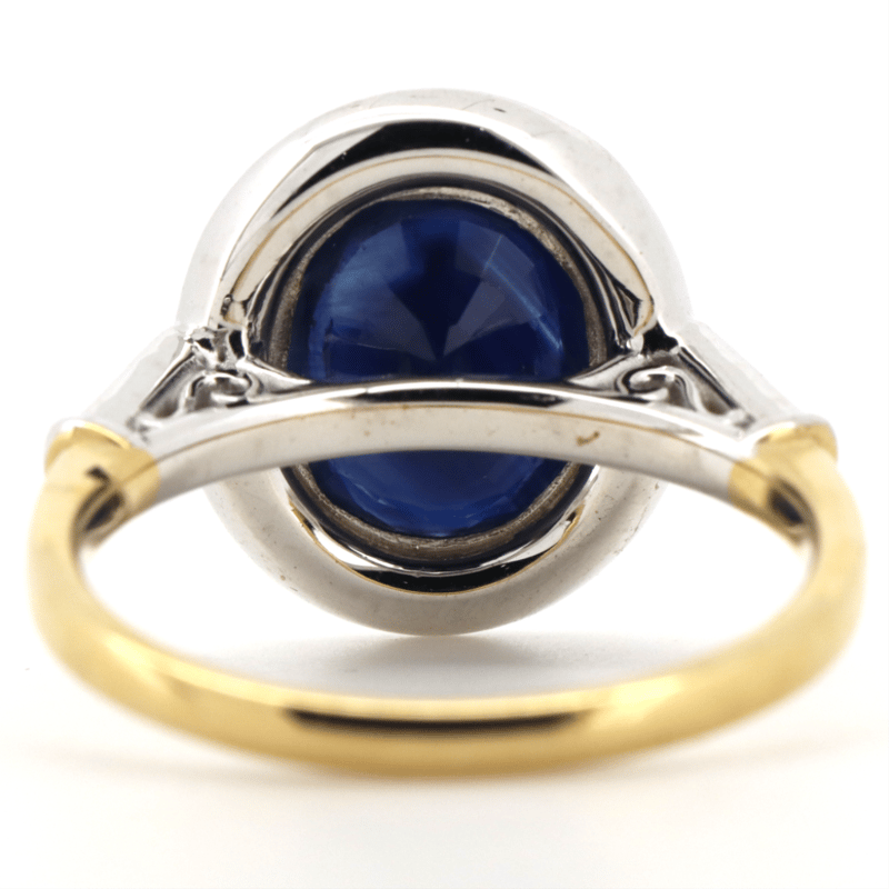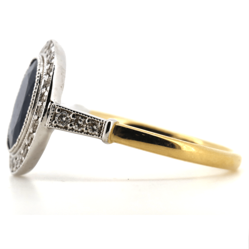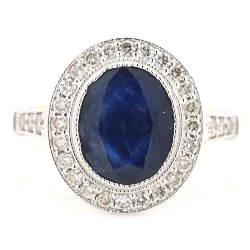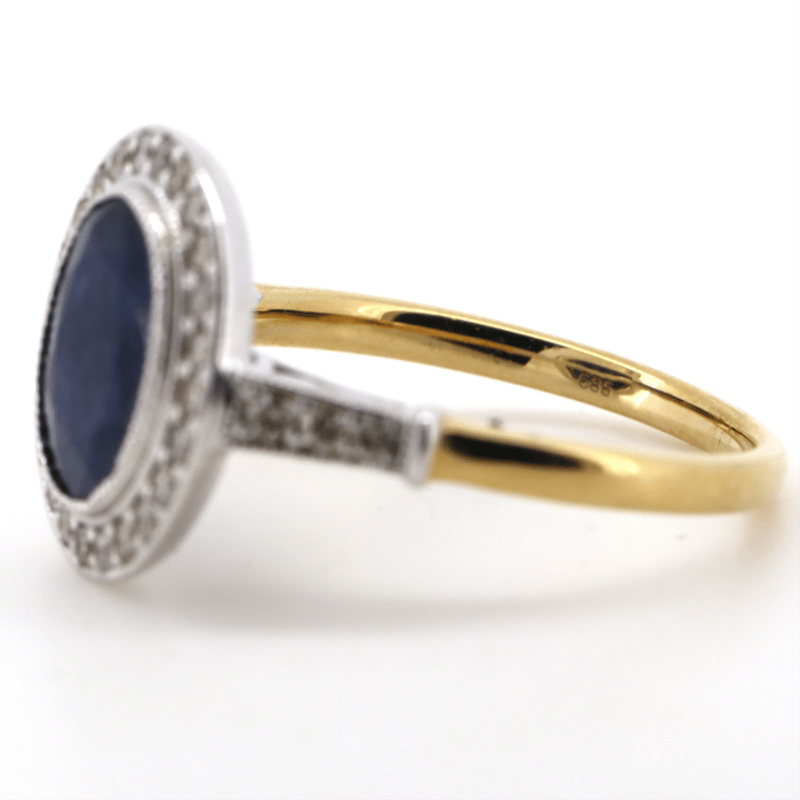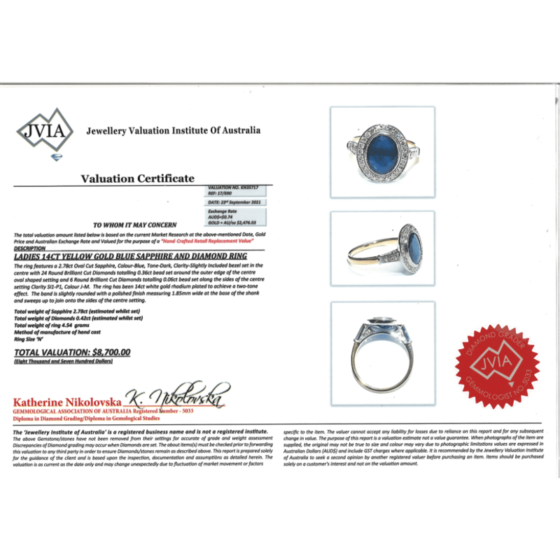 14K YELLOW GOLD, BLUE SAPPHIRE AND DIAMOND, HALO RING. The Central Design Features, One Oval Cut, Dark Blue, Sapphire (2.78Ct, Slightly Included), Bezel Set With Millgrain Detail. Surrounding The Centre In A Halo And Decorating The Band Are, 34 Round Brilliant Cut, Diamonds (0.42Ct Tdw J-M Colour, Si1-P1 Clarity), Shared Claw Set In White Gold. Ring Size N. Valuations Provided by an Independent Third-Party Professional Not Directly Associated With Lloyds Auctions at AUD $$8,700.00This valuation has been conducted by an independent third-party professional. The valuation amount is an assessment by the issuing valuer and does not reflect the auction value of the item. Any inquiries regarding the valuation should be directed to the issuing valuer (refer to contact details on the certificate), as Lloyds Auctions has no affiliation or influence over the valuation, the valuer, or the stated amount. Condition: Good - Refer Images 0645986+1438