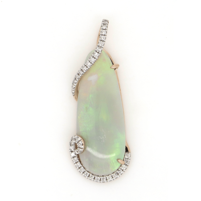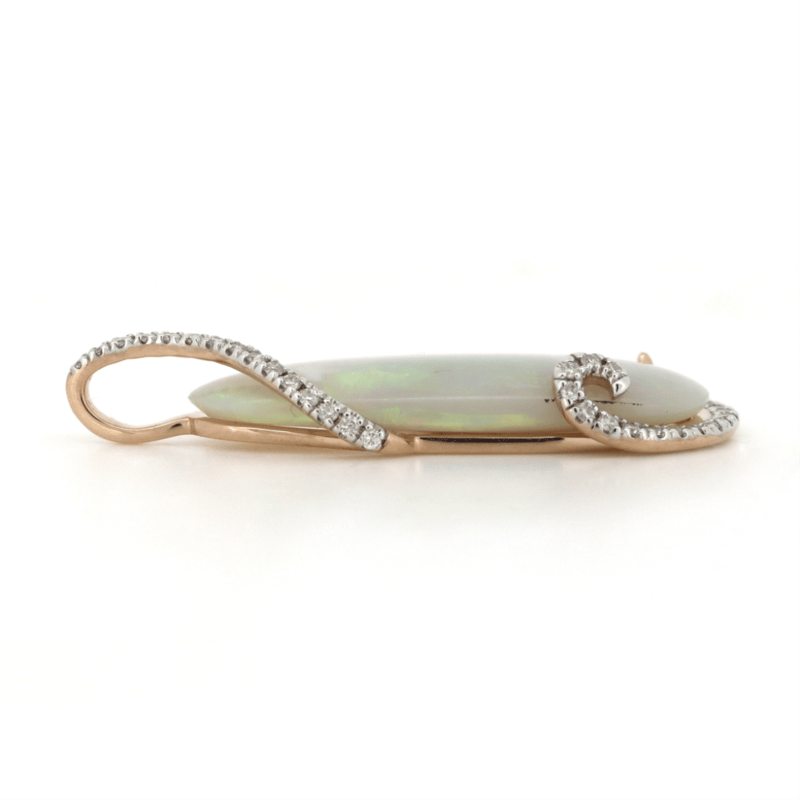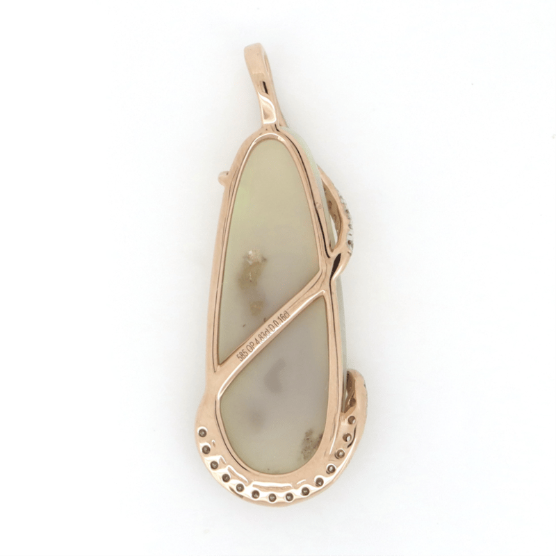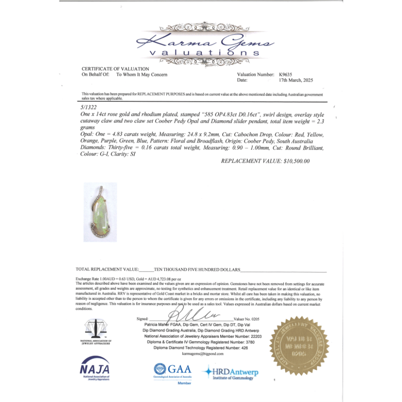 14K ROSE GOLD, 4.83CT COOBER PEDY OPAL AND DIAMOND, DECORATIVE SWIRL PENDANT. The Centre Features, One Cabochon Cut, Flashes Of Red, Yellow, Orange, Purple, Green, Blue, Coober Pedy Opal (4.83Ct), Claw Set. Surrounding The Centre Are, 35 Round Brilliant Cut, Diamonds (0.16Ct Tdw, G-I Colour, Si Clarity), Micro-Bead Set. Valuations Provided by an Independent Third-Party Professional Not Directly Associated With Lloyds Auctions at AUD $$10,500.00This valuation has been conducted by an independent third-party professional. The valuation amount is an assessment by the issuing valuer and does not reflect the auction value of the item. Any inquiries regarding the valuation should be directed to the issuing valuer (refer to contact details on the certificate), as Lloyds Auctions has no affiliation or influence over the valuation, the valuer, or the stated amount. Condition: Good - Refer Images 0645986+1441