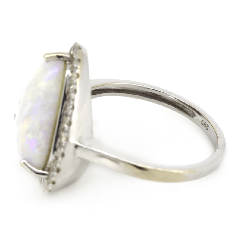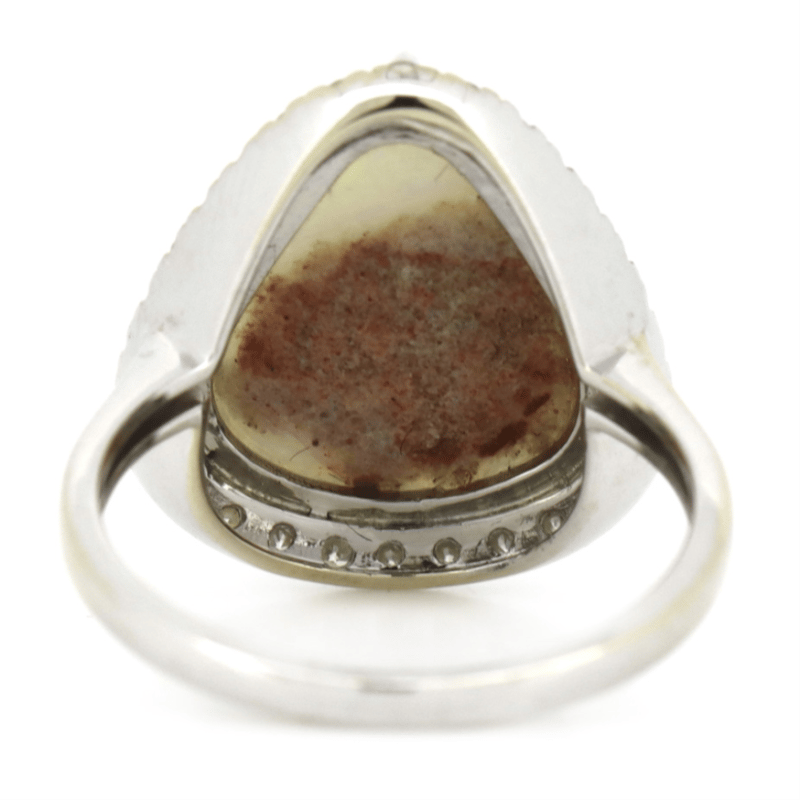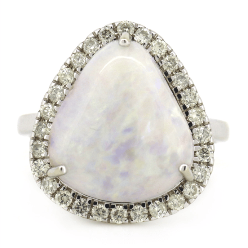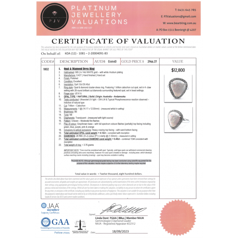 14K WHITE GOLD, 4.12CT AUSTRALIAN ANDAMOOKA OPAL AND DIAMOND, HALO RING. The Centre Features, One Trillion Cabochon Cut, Solid Natural, Australian Andamooka Opal (4.12Ct, Green, Blue, Purple, Pink And Orange Colour Play, Moderate Fire Flash Pattern), Claw Set. Surrounding The Centre In A Halo Are, 28 Round Brilliant Cut, Diamonds (0.45Ct Tdw, H-J Colour, P1+ Clarity), Bead Set. Ring Size M. Valuations Provided by an Independent Third-Party Professional Not Directly Associated With Lloyds Auctions at AUD $$12,800.00This valuation has been conducted by an independent third-party professional. The valuation amount is an assessment by the issuing valuer and does not reflect the auction value of the item. Any inquiries regarding the valuation should be directed to the issuing valuer (refer to contact details on the certificate), as Lloyds Auctions has no affiliation or influence over the valuation, the valuer, or the stated amount. Condition: Good - Refer Images 0645986+1442