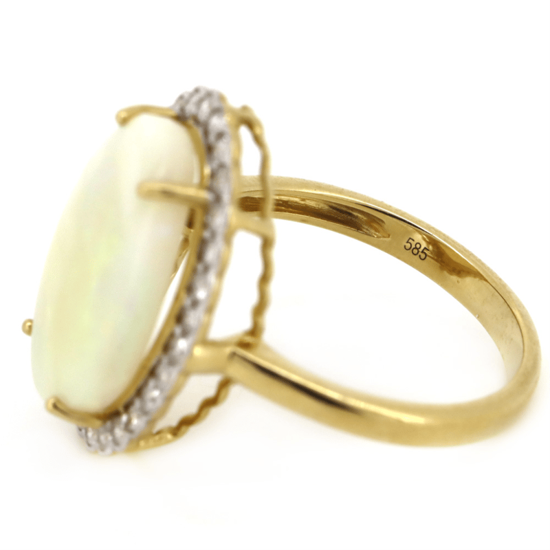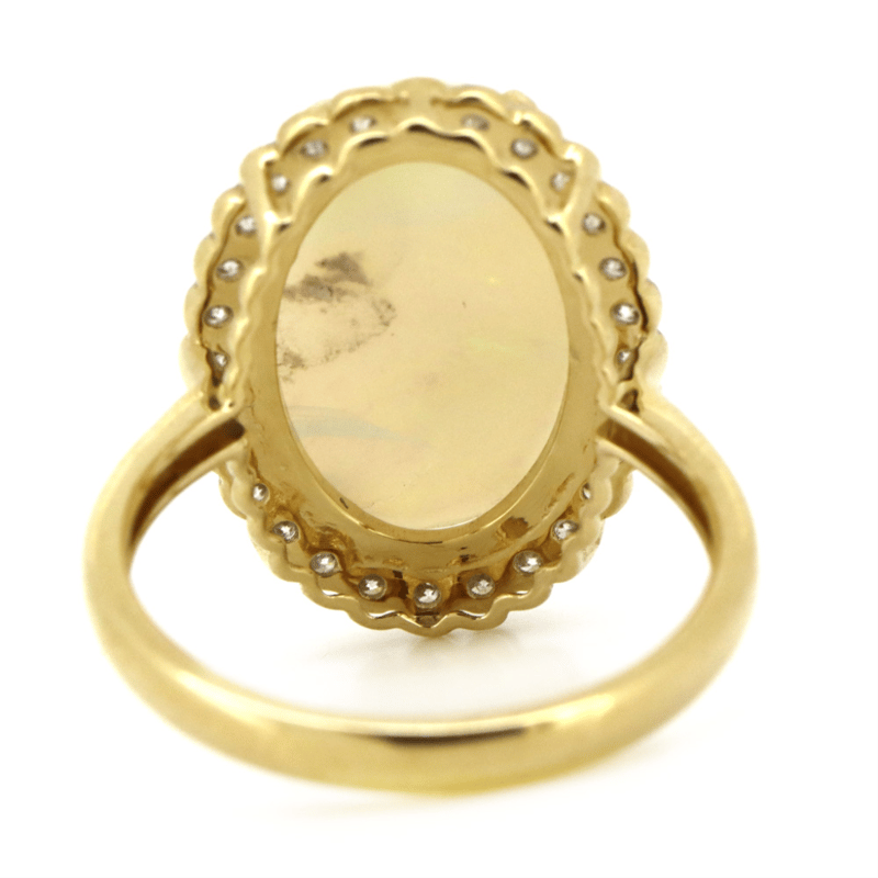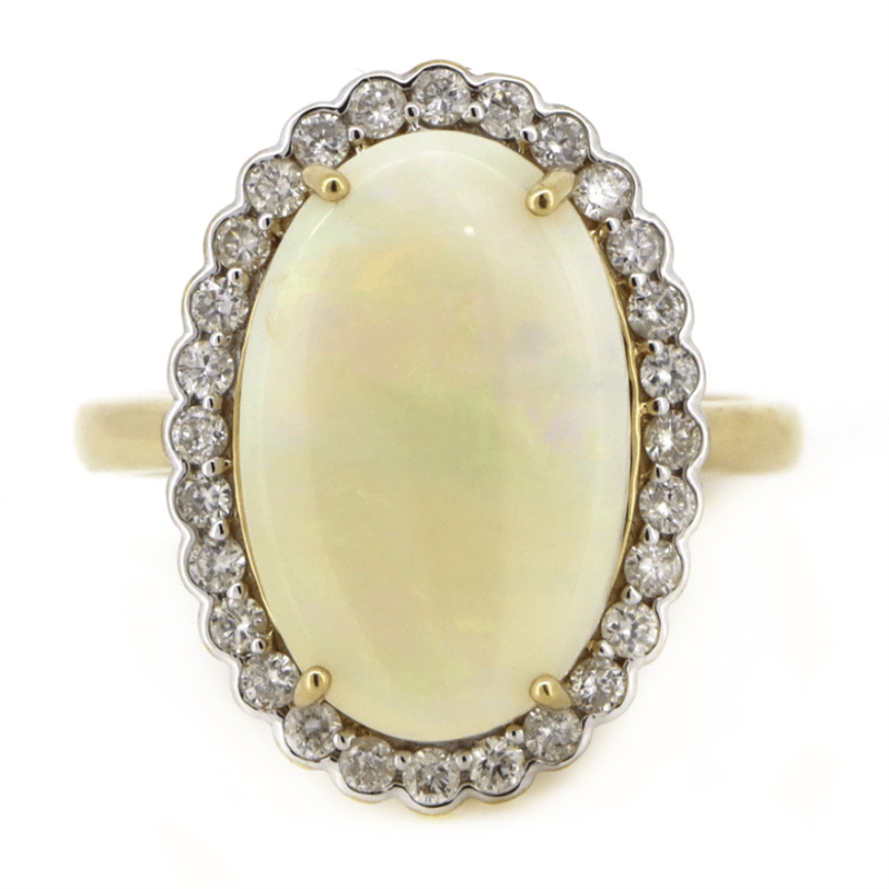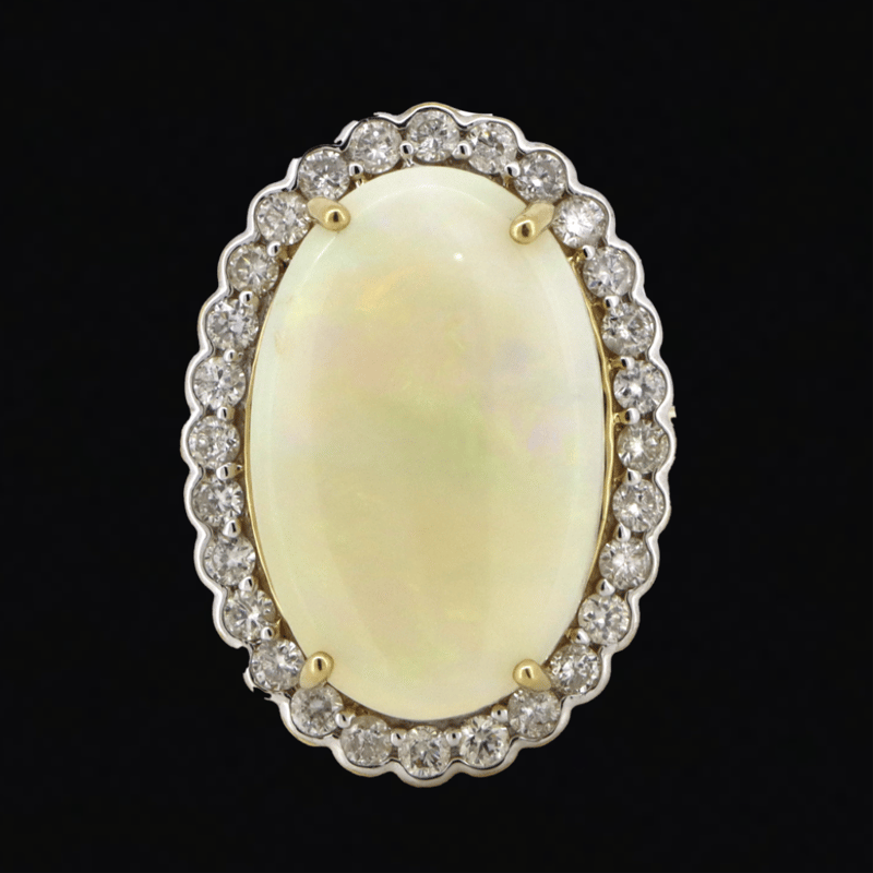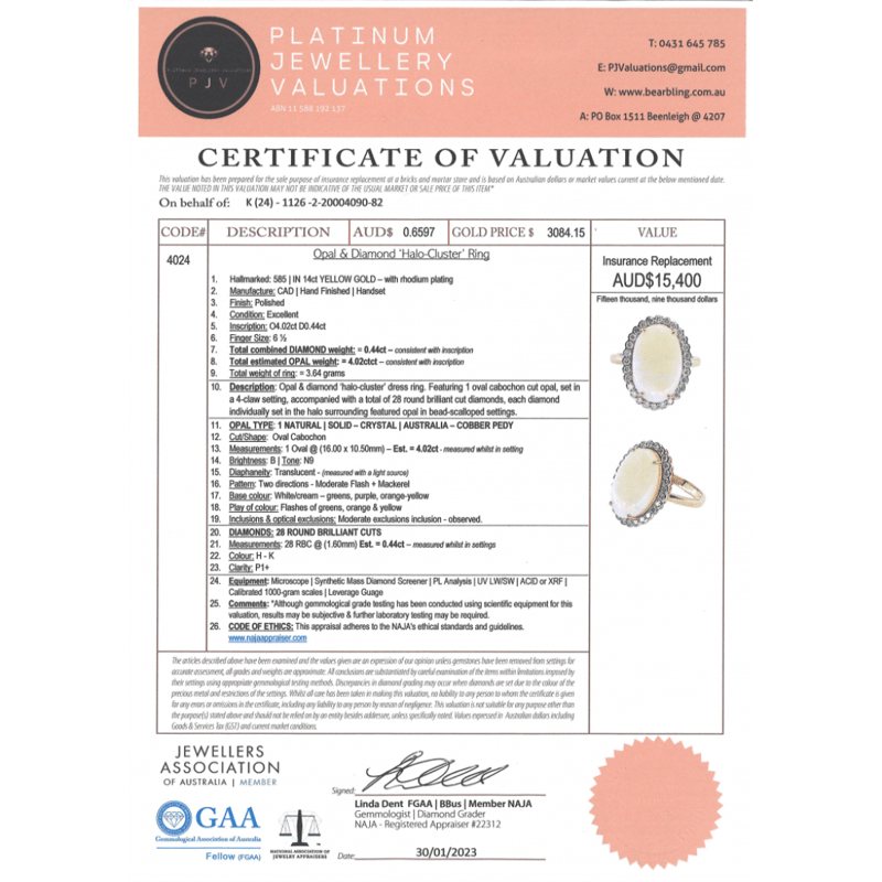 14K YELLOW GOLD, 4.02CT AUSTRALIAN COOBER PEDY OPAL AND DIAMOND, HALO CLUSTER RING. The Centre Features, One Oval Cabochon Cut, Australian Coober Pedy Opal, (4.02Ct, Green, Yellow, Purple And Orange Moderate Play Of Colour), 4 Claw Set. Encompassing The Centre In A Halo Are, 28 Round Brilliant Cut, Diamonds (0.44Ct Tdw, H-K Colour, P1+ Clarity), Bead-Scalloped Setting. Ring Size M. Valuations Provided by an Independent Third-Party Professional Not Directly Associated With Lloyds Auctions at AUD $$15,400.00This valuation has been conducted by an independent third-party professional. The valuation amount is an assessment by the issuing valuer and does not reflect the auction value of the item. Any inquiries regarding the valuation should be directed to the issuing valuer (refer to contact details on the certificate), as Lloyds Auctions has no affiliation or influence over the valuation, the valuer, or the stated amount. Condition: Good - Refer Images 0645986+1443