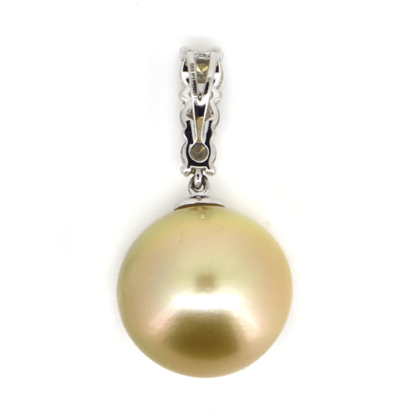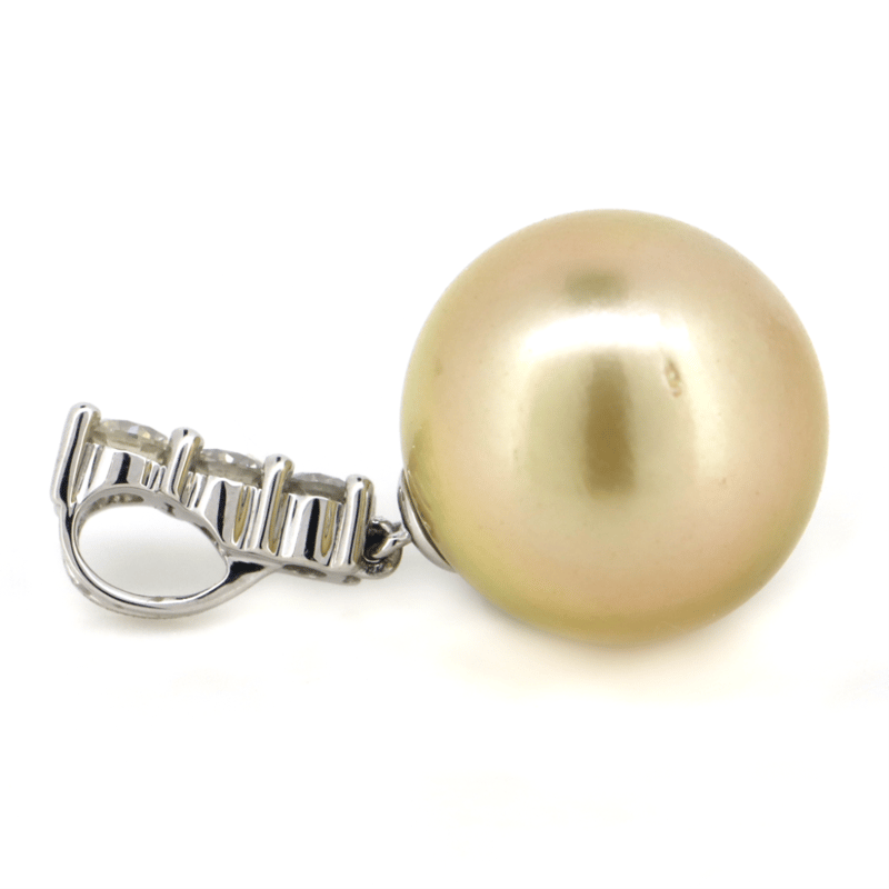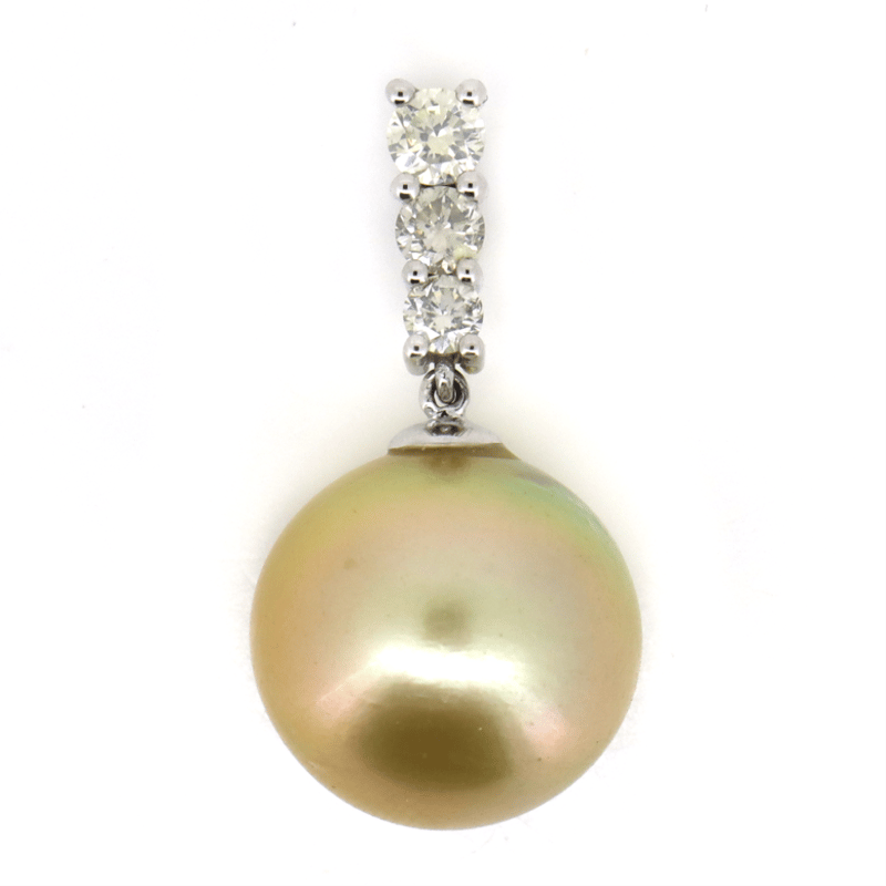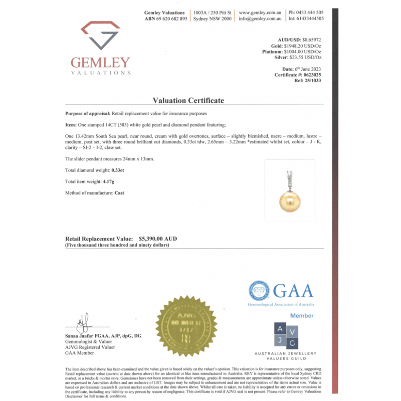 14K WHITE GOLD, GOLDEN CULTURED SOUTH SEA PEARL AND DIAMOND, DROP PENDANT. The Design Features, One Near Round, Cream With Gold Overtones, Cultured South Sea Pearl (13.42Mm Size, Medium Lustre, Slightly Blemished), Post Set. Decorating The Bail Are, 3 Round Brilliant Cut, Diamonds (0.33Ct Tdw, J-K Colour, Si2-I2 Clarity), Claw Set. Valuations Provided by an Independent Third-Party Professional Not Directly Associated With Lloyds Auctions at AUD $$5,390.00This valuation has been conducted by an independent third-party professional. The valuation amount is an assessment by the issuing valuer and does not reflect the auction value of the item. Any inquiries regarding the valuation should be directed to the issuing valuer (refer to contact details on the certificate), as Lloyds Auctions has no affiliation or influence over the valuation, the valuer, or the stated amount. Condition: Good - Refer Images 0645986+1447