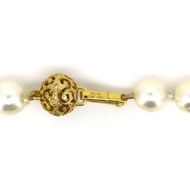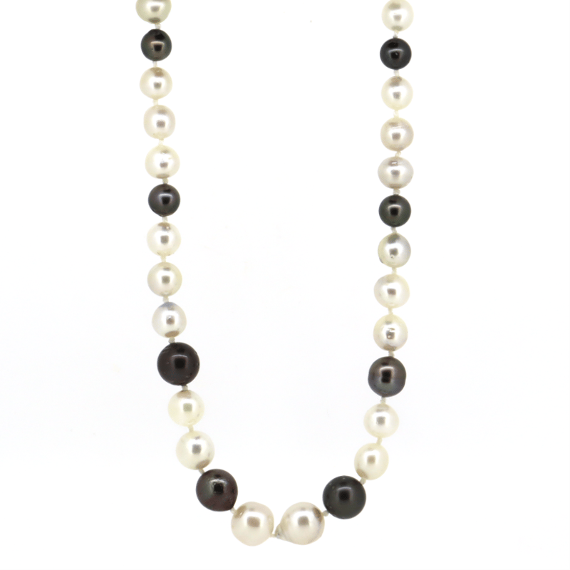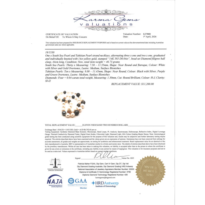 14K YELLOW GOLD, WHITE CULTURED SOUTH SEA PEARL, BLACK CULTURED TAHITIAN PEARL AND DIAMOND, STRAND NECKLACE. The Design Features, 30 Near Round, White With Silver/Gold Overtones, Cultured South Sea Pearls (7.50Mm -11.55Mm Size, Medium Lustre, Surface Blemishes), Strung And Knotted. Alternating Between Are, 10 Near Round, Black With Green/Purple Overtones, Cultured Tahitian Pearls (8.00Mm - 11.45Mm Size, Medium Lustre, Natural Surface Blemishes), Strung And Knotted. Embellishing The 14K Yellow Gold Filigree Ball Clasp Are, 4 Round Brilliant Cut, Diamonds (0.04Ct Tdw, H-J Colour, Si-I2 Clarity), Bead Set. Necklace Length Is 44Cm. Valuations Provided by an Independent Third-Party Professional Not Directly Associated With Lloyds Auctions at AUD $$11,200.00This valuation has been conducted by an independent third-party professional. The valuation amount is an assessment by the issuing valuer and does not reflect the auction value of the item. Any inquiries regarding the valuation should be directed to the issuing valuer (refer to contact details on the certificate), as Lloyds Auctions has no affiliation or influence over the valuation, the valuer, or the stated amount. Condition: Good - Refer Images 0645986+1449