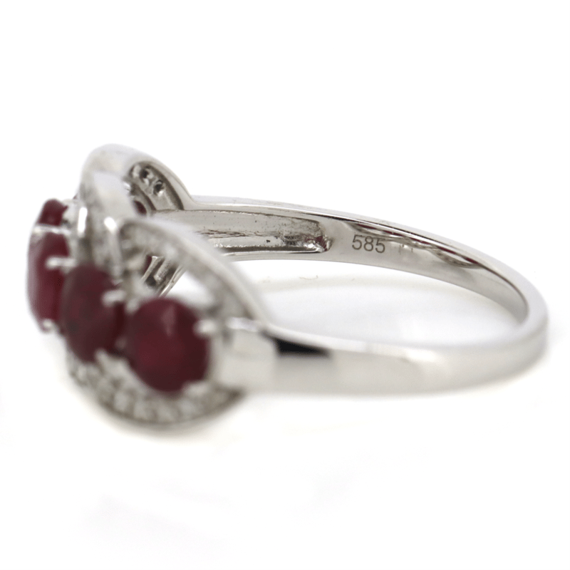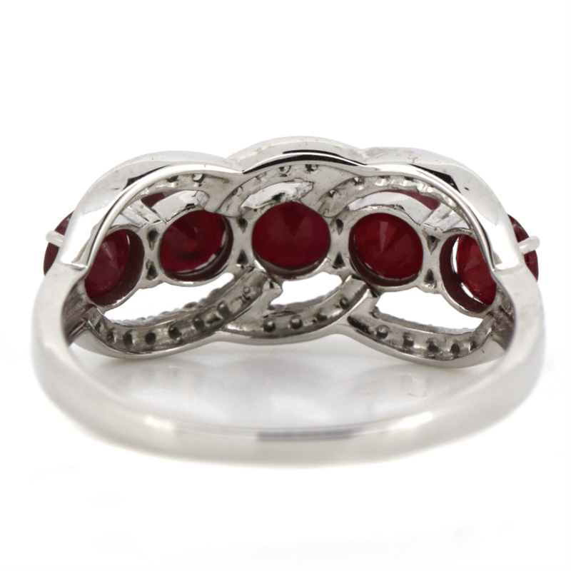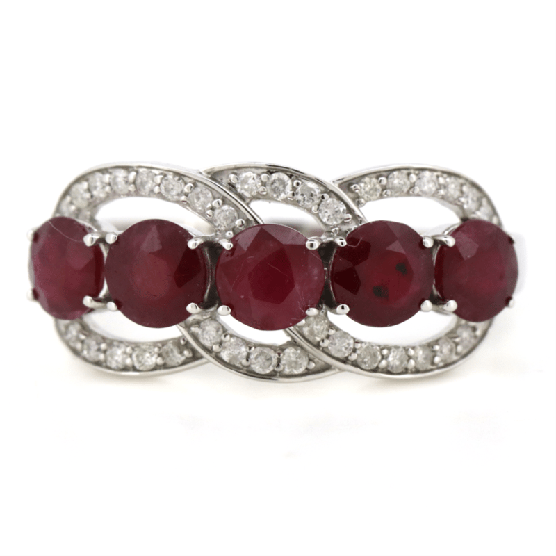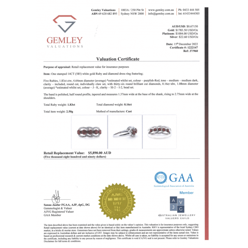 14K WHITE GOLD, RUBY AND DIAMOND, ETERNITY RING. The Design Centrally Features, 5 Round Cut, Purplish-Red, Rubies (1.83Ct Tsw, Included), Claw Set. Decorating The Setting Are, 36 Round Brilliant Cut, Diamonds (0.16Ct Tdw, J-K Colour, Si2-I2 Clarity), Bead Set. Ring Size M. Valuations Provided by an Independent Third-Party Professional Not Directly Associated With Lloyds Auctions at AUD $$5,890.00This valuation has been conducted by an independent third-party professional. The valuation amount is an assessment by the issuing valuer and does not reflect the auction value of the item. Any inquiries regarding the valuation should be directed to the issuing valuer (refer to contact details on the certificate), as Lloyds Auctions has no affiliation or influence over the valuation, the valuer, or the stated amount. Condition: Good - Refer Images 0645986+1454