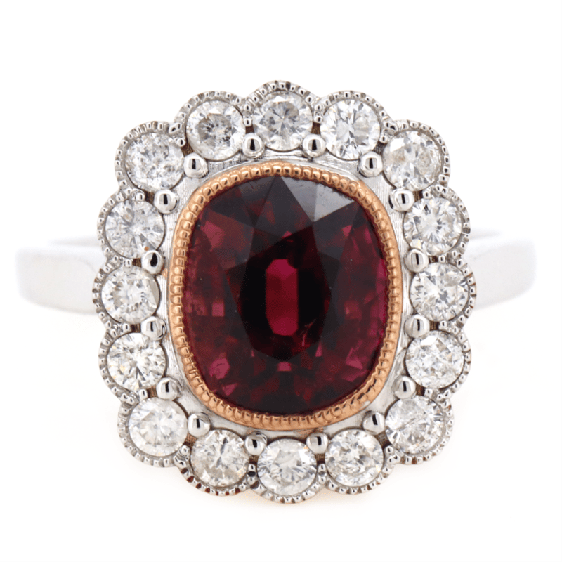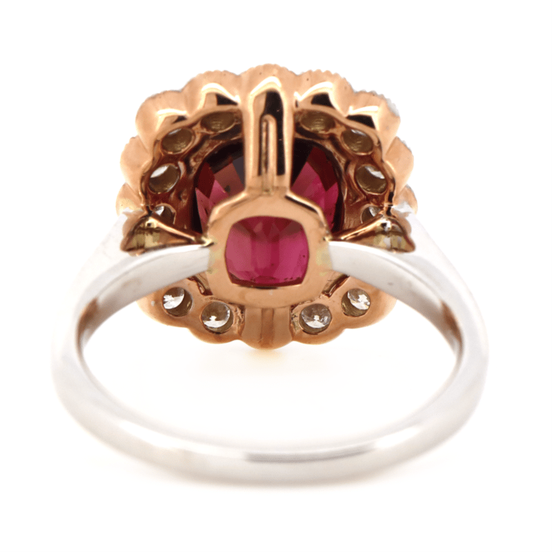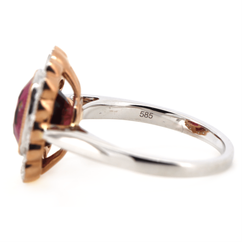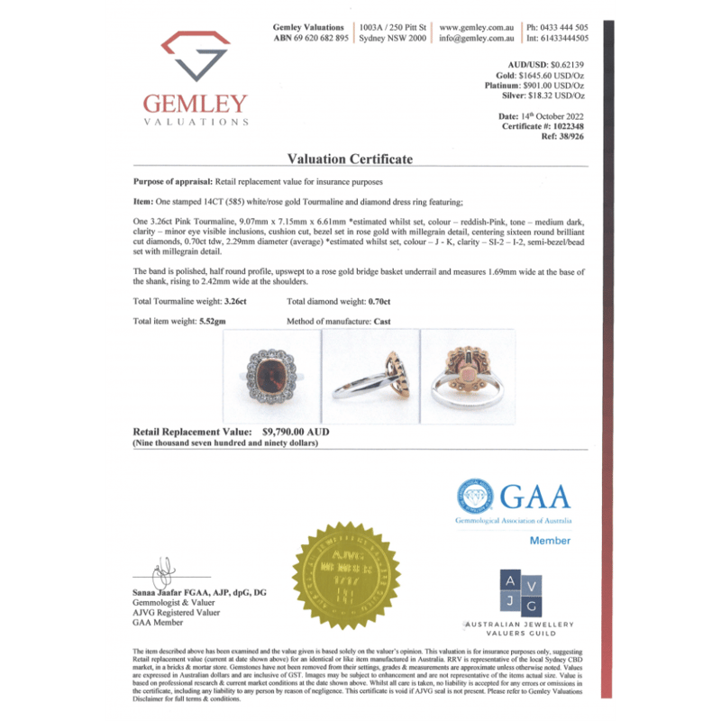 14K ROSE/WHITE GOLD, PINK TOURMALINE AND DIAMOND, HALO RING. The Centre Features, One Cushion Cut, Reddish-Pink, Tourmaline (3.26Ct, Minor Eye Visible Inclusions), Bezel Set In Rose Gold With Millegrain Detail. Surrounding The Centre In A Halo Are, 16 Round Brilliant Cut, Diamonds (0.70Ct Tdw, J-K Colour, Si2-I2 Clarity), Semi Bezel/Bead Set With Millegrain Detail. Ring Size N. Valuations Provided by an Independent Third-Party Professional Not Directly Associated With Lloyds Auctions at AUD $$9,790.00This valuation has been conducted by an independent third-party professional. The valuation amount is an assessment by the issuing valuer and does not reflect the auction value of the item. Any inquiries regarding the valuation should be directed to the issuing valuer (refer to contact details on the certificate), as Lloyds Auctions has no affiliation or influence over the valuation, the valuer, or the stated amount. Condition: Good - Refer Images 0645986+1456