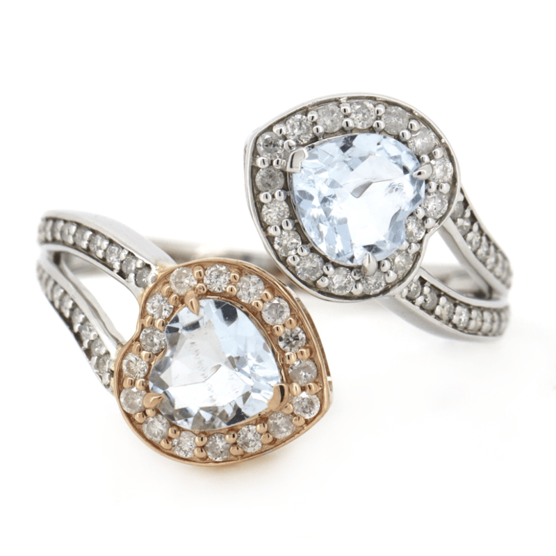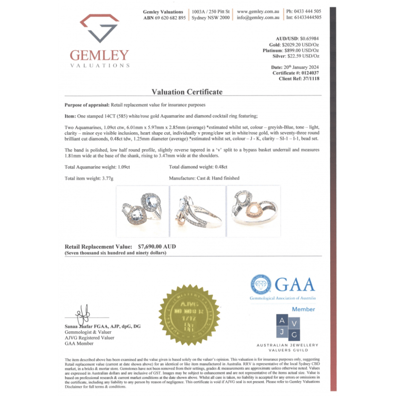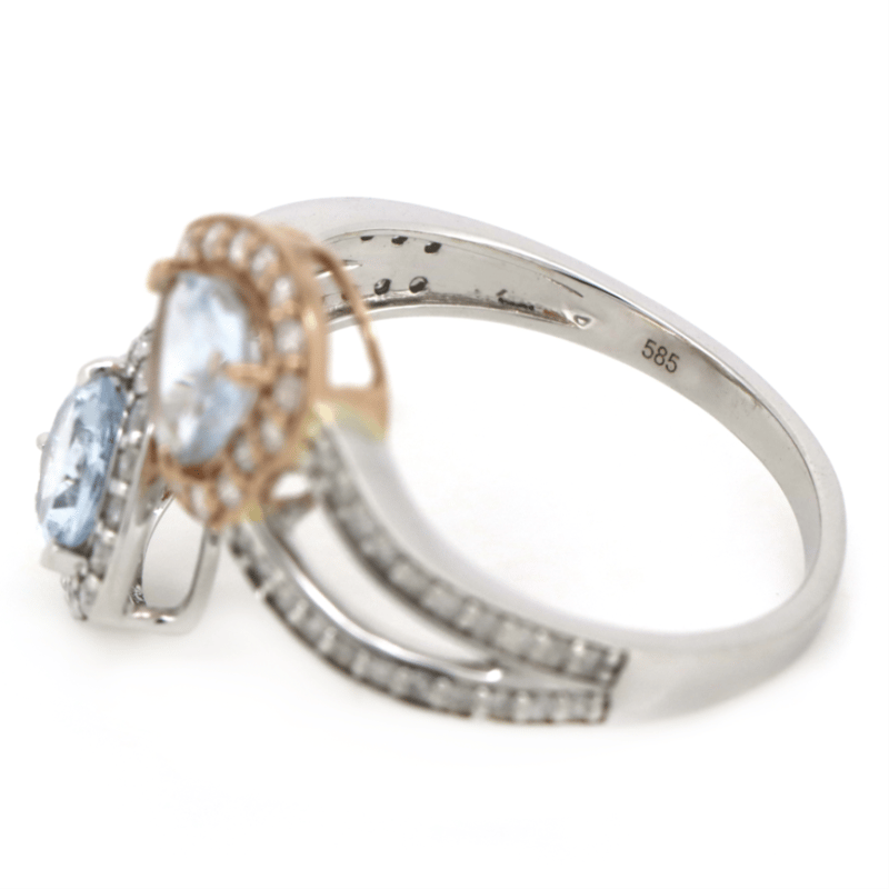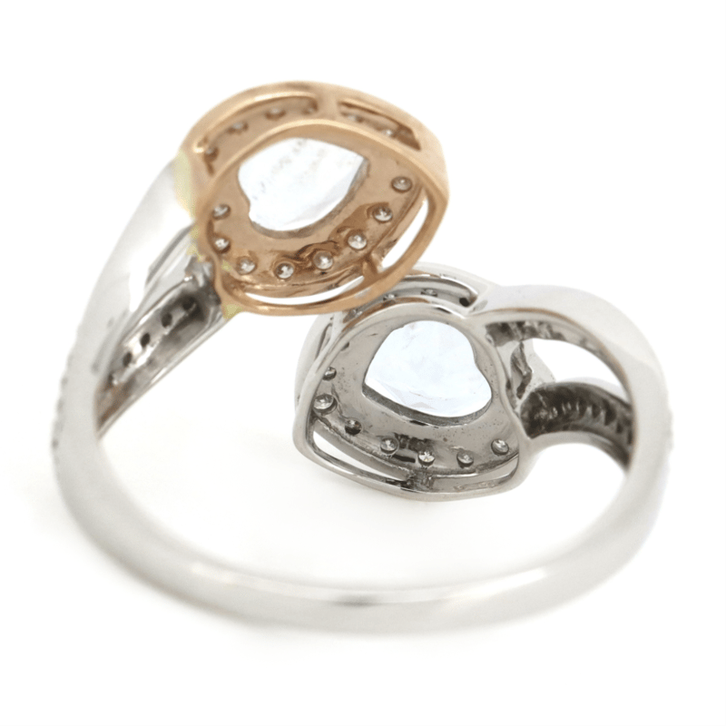 14K WHITE/ROSE GOLD, AQUAMARINE AND DIAMOND, OPEN BAND DRESS RING. The Design Features, 2 Heart Shape Cut, Light Greyish-Blue, Aquamarines (1.09Ct Tsw, Minor Eye Visible Inclusions), V Prong/Claw Set. Surrounding The Stones In Halos And Decorating The Split Band Are, 73 Round Brilliant Cut, Diamonds (0.48Ct Tdw, J-K Colour, Si1-I1 Clarity), Bead Set. Ring Size R 1/2. Valuations Provided by an Independent Third-Party Professional Not Directly Associated With Lloyds Auctions at AUD $$7,690.00This valuation has been conducted by an independent third-party professional. The valuation amount is an assessment by the issuing valuer and does not reflect the auction value of the item. Any inquiries regarding the valuation should be directed to the issuing valuer (refer to contact details on the certificate), as Lloyds Auctions has no affiliation or influence over the valuation, the valuer, or the stated amount. Condition: Good - Refer Images 0645986+1460