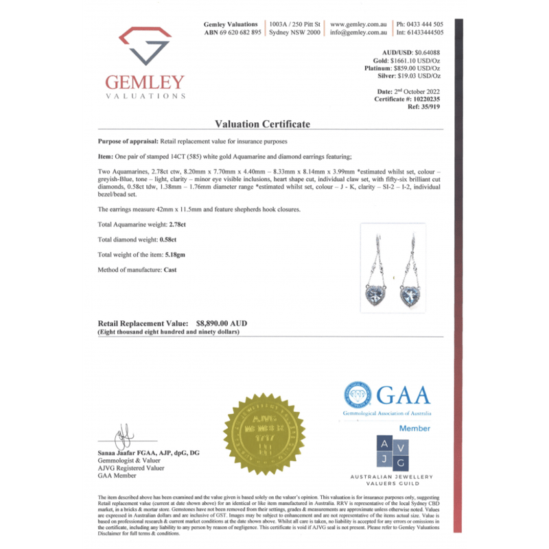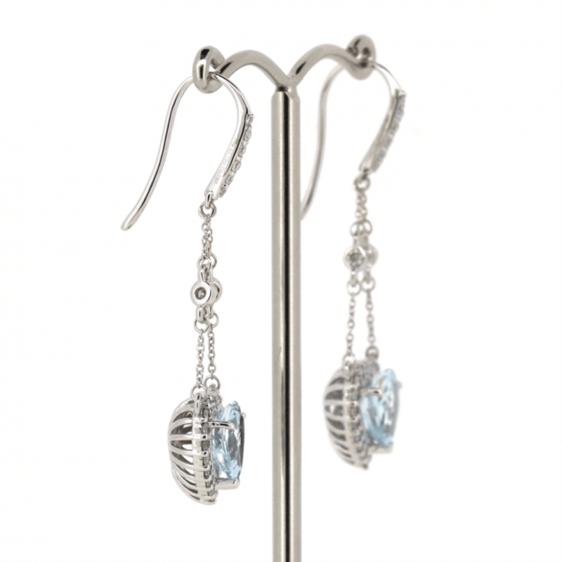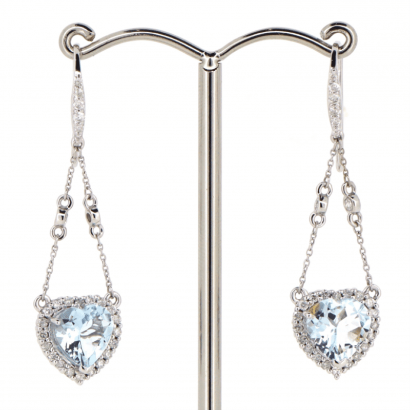 14K WHITE GOLD, AQUAMARINE AND DIAMOND, CHANDELIER STYLE EARRINGS. The Earrings Feature, 2 Heart Cut, Light Greyish-Blue, Aquamarines (2.78Ct Tsw, Minor Eye Visible Inclusions), Individually Claw Set. Surrounding The Centres And Decorating The Chains And Hooks Are, 56 Round Brilliant Cut, Diamonds (0.58Ct Tdw, J-K Colour, Si2-I2 Clarity), Individually Bead/Bezel Set. The Earrings Have Shepherd Hooks. Valuations Provided by an Independent Third-Party Professional Not Directly Associated With Lloyds Auctions at AUD $$8,890.00This valuation has been conducted by an independent third-party professional. The valuation amount is an assessment by the issuing valuer and does not reflect the auction value of the item. Any inquiries regarding the valuation should be directed to the issuing valuer (refer to contact details on the certificate), as Lloyds Auctions has no affiliation or influence over the valuation, the valuer, or the stated amount. Condition: Good - Refer Images 0645986+1461