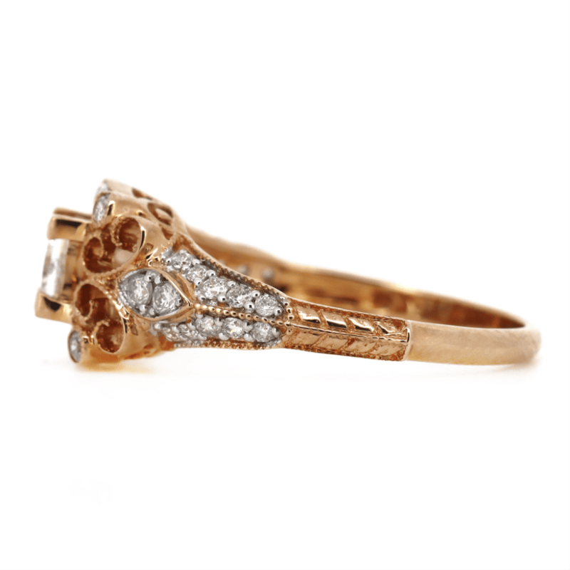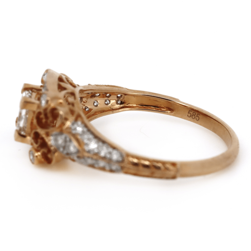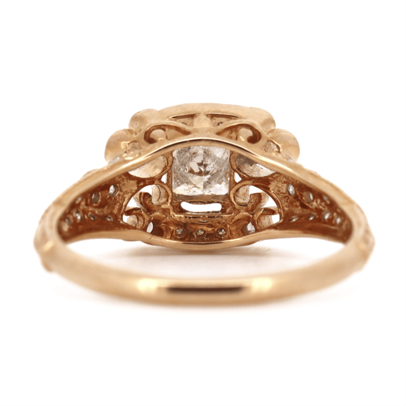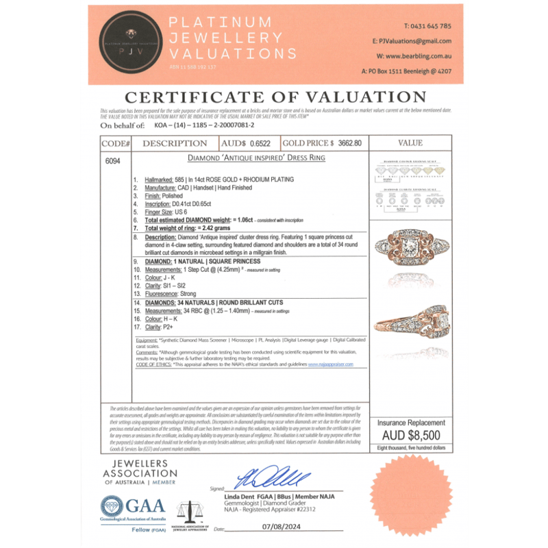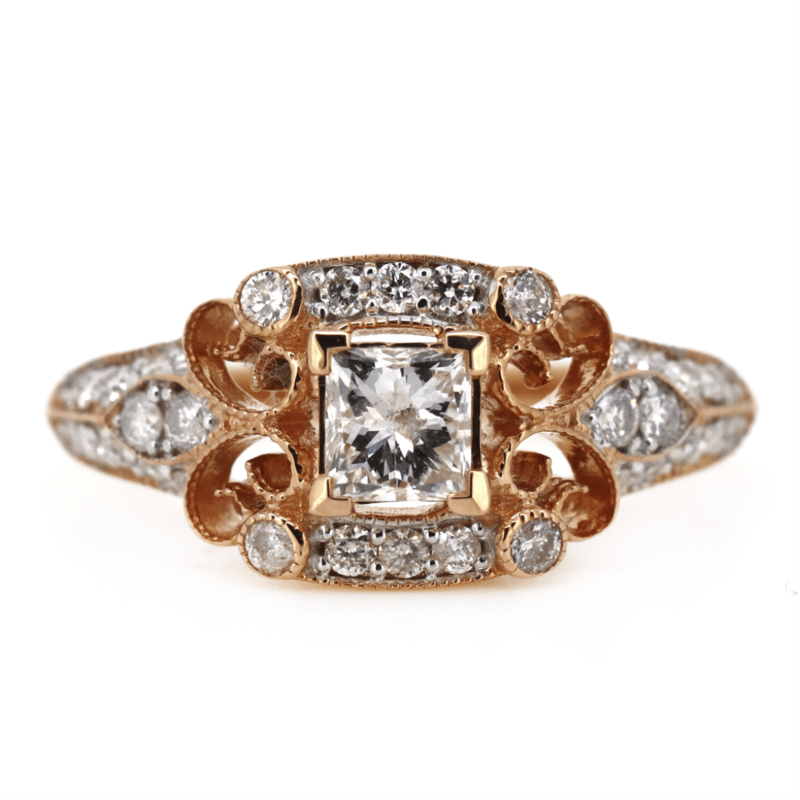 14K ROSE GOLD AND DIAMOND, VINTAGE INSPIRED RING. The Centre Features, One Square Princess Cut, Diamond (0.41Ct, J-K Colour, Si1-Si2 Clarity), Claw Set. Encompassing The Centre Are, 34 Round Brilliant Cut, Diamonds (0.36Ct Tdw, H-K Colour, P2 Clarity), Micro-Bead Set With Millegrain Detail. Ring Size L. Valuations Provided by an Independent Third-Party Professional Not Directly Associated With Lloyds Auctions at AUD $$8,500.00This valuation has been conducted by an independent third-party professional. The valuation amount is an assessment by the issuing valuer and does not reflect the auction value of the item. Any inquiries regarding the valuation should be directed to the issuing valuer (refer to contact details on the certificate), as Lloyds Auctions has no affiliation or influence over the valuation, the valuer, or the stated amount. Condition: Good - Refer Images 0645986+1464