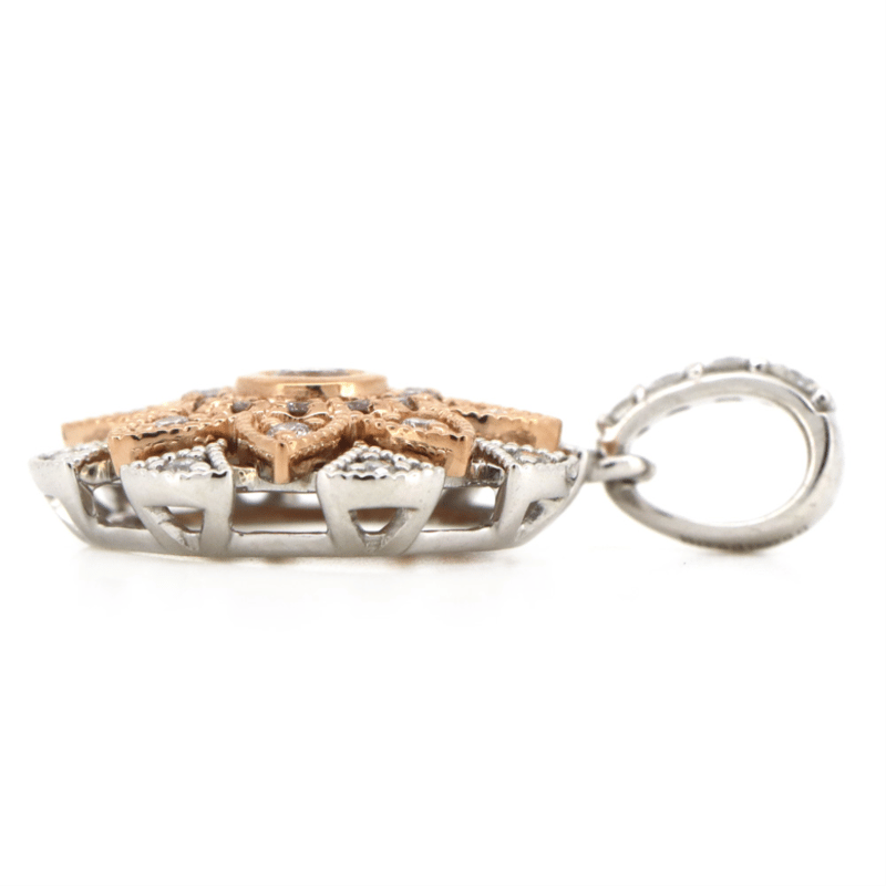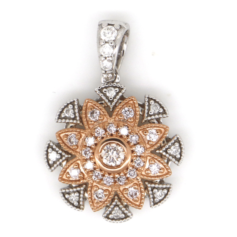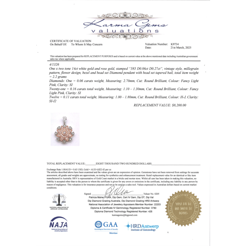 14K WHITE/ROSE GOLD, FANCY PINK DIAMOND AND DIAMOND, DECORATIVE DROP PENDANT. The Centre Features, One Round Brilliant Cut, Fancy Blush Pink, Diamond (0.06Ct, Si Clarity), Bezel Set. Encompassing The Design Are, 21 Round Brilliant Cut, Fancy Light Pink, Diamonds (0.16Ct Tdw, Si Clarity), Claw And Bead Set. Decorating The Outer Design Are, 12 Round Brilliant Cut, Diamonds (0.11Ct Tdw, H-J Colour, Si-I2 Clarity), Bead Set. Valuations Provided by an Independent Third-Party Professional Not Directly Associated With Lloyds Auctions at AUD $$8,200.00This valuation has been conducted by an independent third-party professional. The valuation amount is an assessment by the issuing valuer and does not reflect the auction value of the item. Any inquiries regarding the valuation should be directed to the issuing valuer (refer to contact details on the certificate), as Lloyds Auctions has no affiliation or influence over the valuation, the valuer, or the stated amount. Condition: Good - Refer Images 0645986+1465