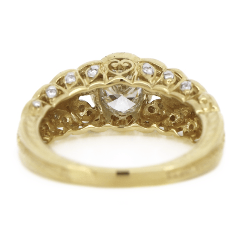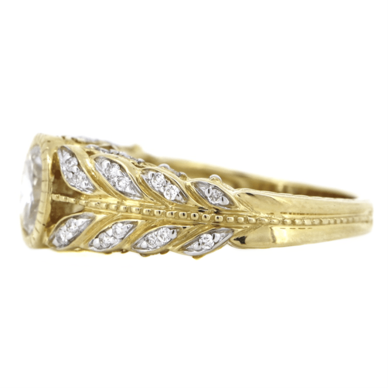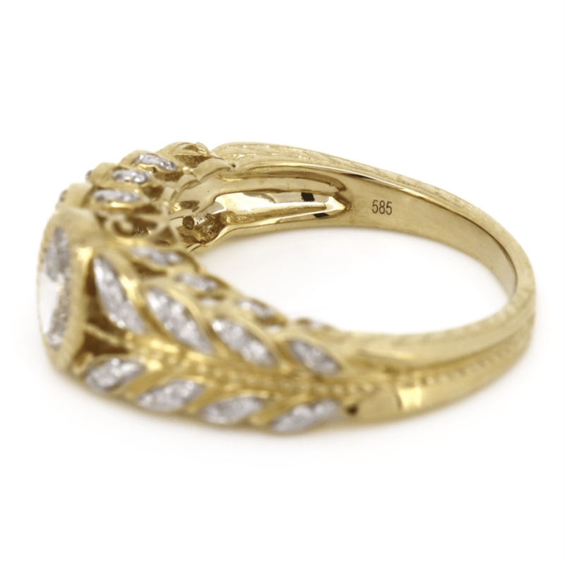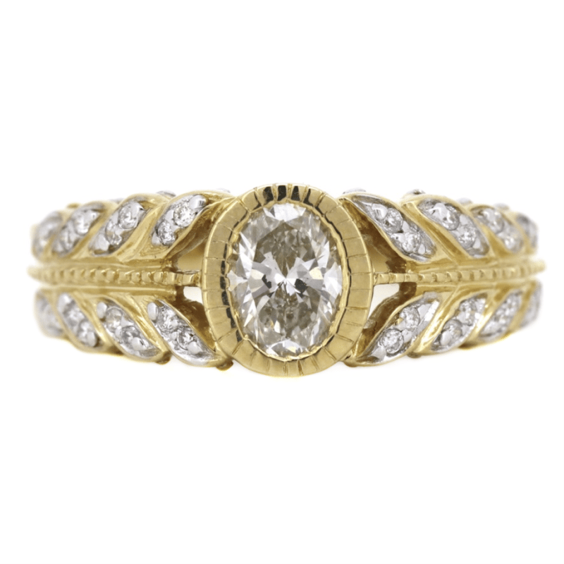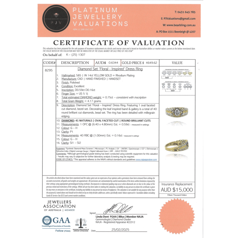 14K YELLOW GOLD AND DIAMOND, ORNATE DRESS RING. The Centre Features, One Oval Faceted Cut, Diamond (0.59Ct, G-H Colour, P1 Clarity), Bezel Set With Millegrain Detail. Decorating The Band Are, 40 Round Brilliant Cut, Diamonds (0.16Ct Tdw, G-H Colour, Si1-Si2 Clarity), Bead Set. The Ring Has Been Detailed With Millegrain Edging. Ring Size K. Valuations Provided by an Independent Third-Party Professional Not Directly Associated With Lloyds Auctions at AUD $$15,000.00This valuation has been conducted by an independent third-party professional. The valuation amount is an assessment by the issuing valuer and does not reflect the auction value of the item. Any inquiries regarding the valuation should be directed to the issuing valuer (refer to contact details on the certificate), as Lloyds Auctions has no affiliation or influence over the valuation, the valuer, or the stated amount. Condition: Good - Refer Images 0645986+1467