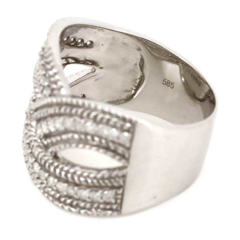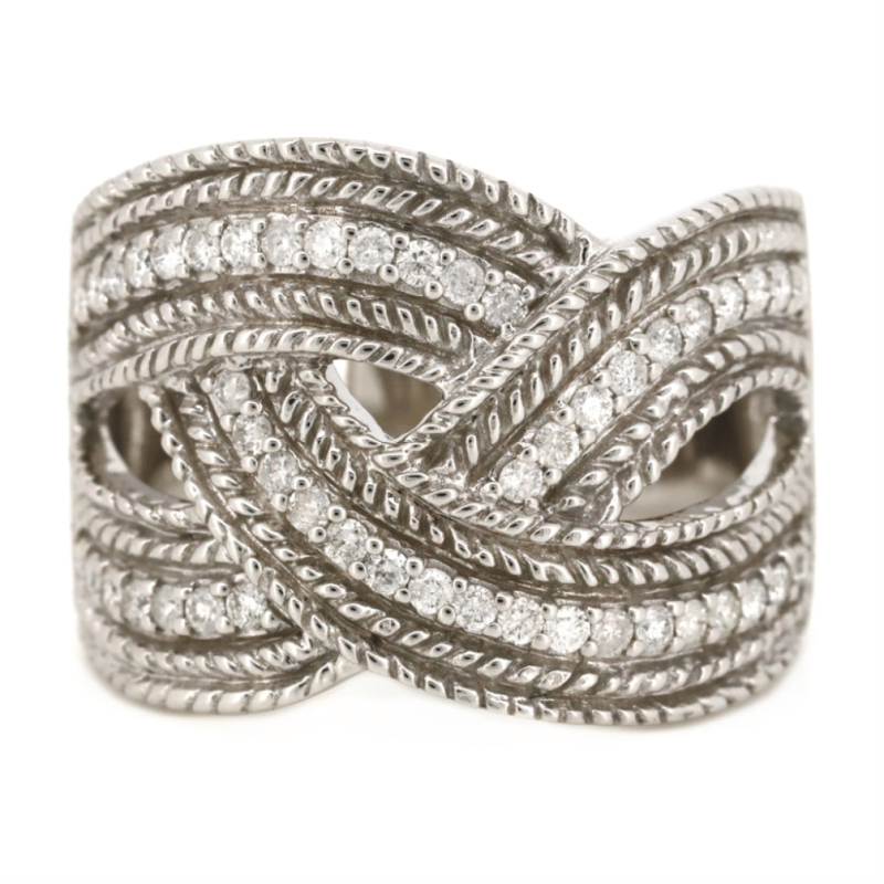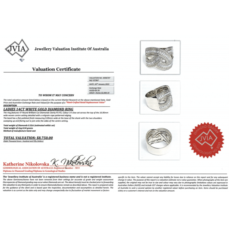 14K WHITE GOLD AND DIAMOND, BRAIDED RING. The Design Features, 47 Round Brilliant Cut, Diamonds (0.52Ct Tdw, J-K Colour, P1-P2 Clarity), Claw Set. Ring Size T. Valuations Provided by an Independent Third-Party Professional Not Directly Associated With Lloyds Auctions at AUD $$8,750.00This valuation has been conducted by an independent third-party professional. The valuation amount is an assessment by the issuing valuer and does not reflect the auction value of the item. Any inquiries regarding the valuation should be directed to the issuing valuer (refer to contact details on the certificate), as Lloyds Auctions has no affiliation or influence over the valuation, the valuer, or the stated amount. Condition: Good - Refer Images 0645986+1468
