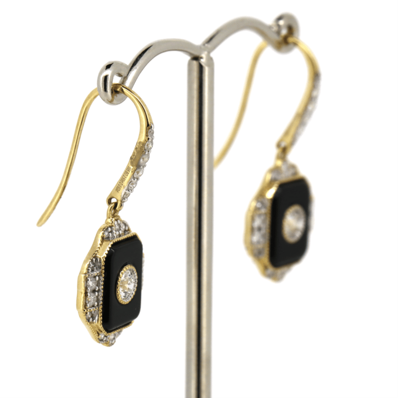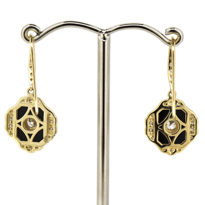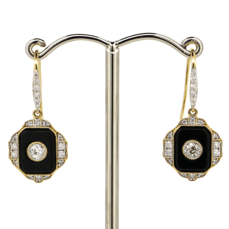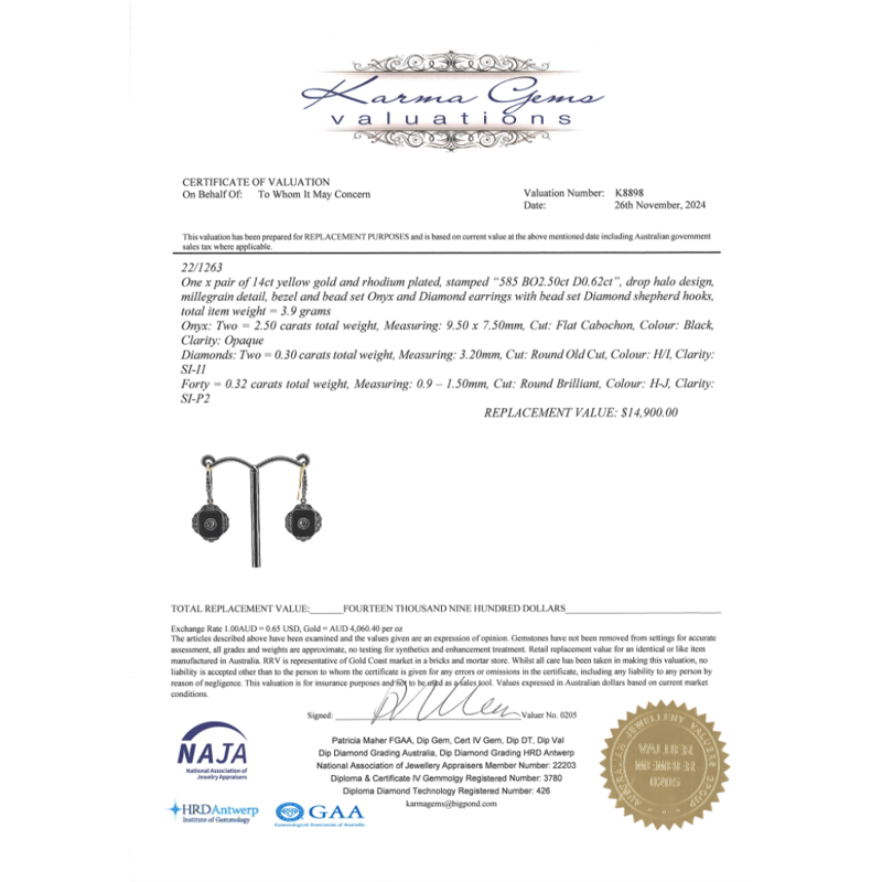 14K YELLOW GOLD, ONYX AND DIAMOND, DROP EARRINGS. The Centre Features, 2 Round Old Mine Cut, Diamonds (0.30Ct Tdw, H-I Colour, Si-I1 Clarity), Bezel Set. Encompassing The Centre And Decorating The Hooks Are, 40 Round Brilliant Cut, Diamonds (0.32Ct Tdw, H-J Colour, Si-P2 Clarity), Bead Set. Decorating The Rest Of The Peice Are, 2 Flat Cabochon Cut, Onyx'S (2.50Ct Tsw, Opaque), Bezel Set. Valuations Provided by an Independent Third-Party Professional Not Directly Associated With Lloyds Auctions at AUD $$14,900.00This valuation has been conducted by an independent third-party professional. The valuation amount is an assessment by the issuing valuer and does not reflect the auction value of the item. Any inquiries regarding the valuation should be directed to the issuing valuer (refer to contact details on the certificate), as Lloyds Auctions has no affiliation or influence over the valuation, the valuer, or the stated amount. Condition: Good - Refer Images 0645986+1470