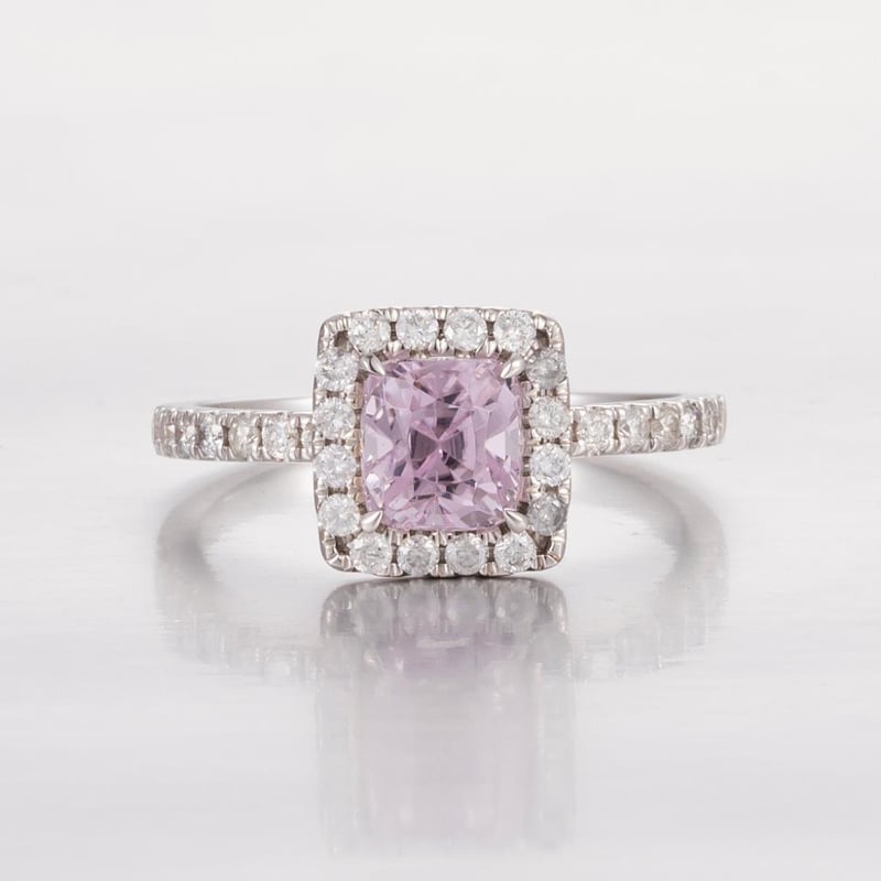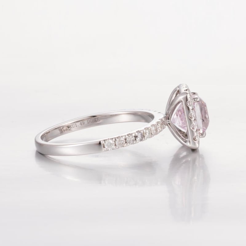 Featuring Centre, One Cushion Cut, Light Pastel Pink Afghan Kunzite (1.49Ct, Eye Clean), Claw Set, With 32 Round Brilliant Cut Diamonds (0.46Ct Tdw, H-I Colour, Si1-I2 Clarity), Claw Set. Ring Size O.