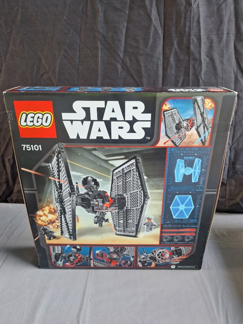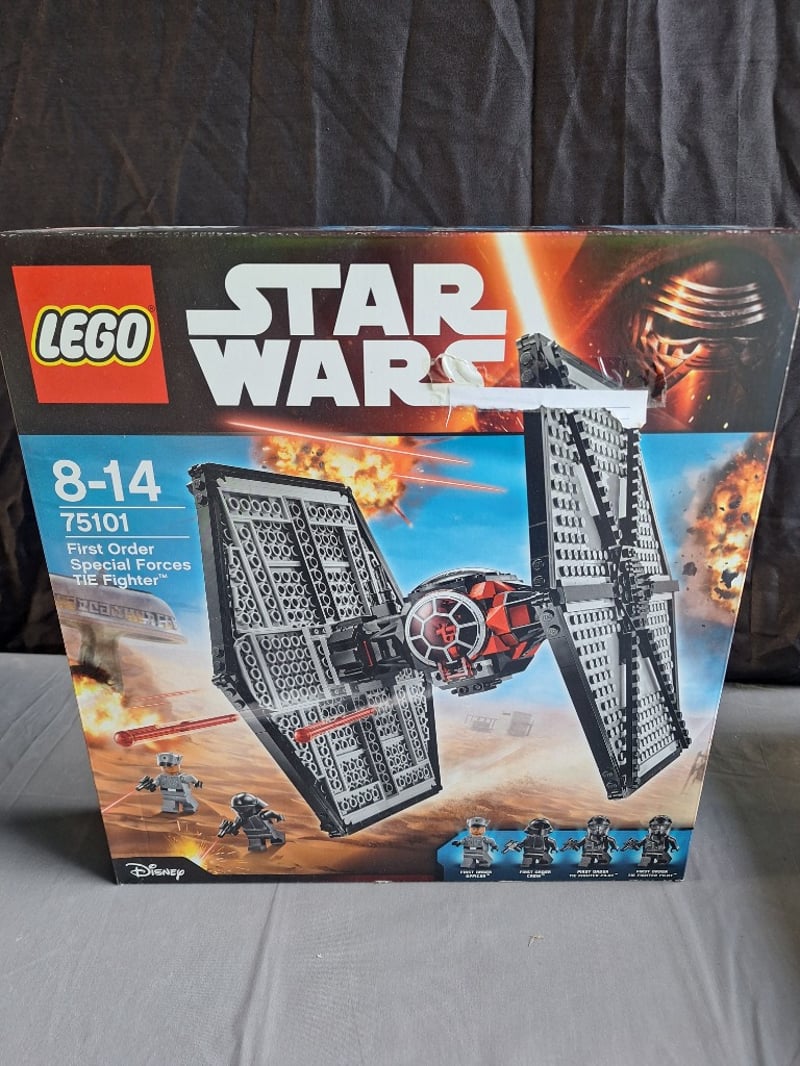 Vintage Lego Star Wars Set 75101 Featuring The First Order Special Forces Tie Fighter With Buildable Spacecraft, Four Minifigures, And Original Packaging. Age-Rated 8-14 Years. Includes Instruction Manual And Component Elements Visible In Original Box Configuration.