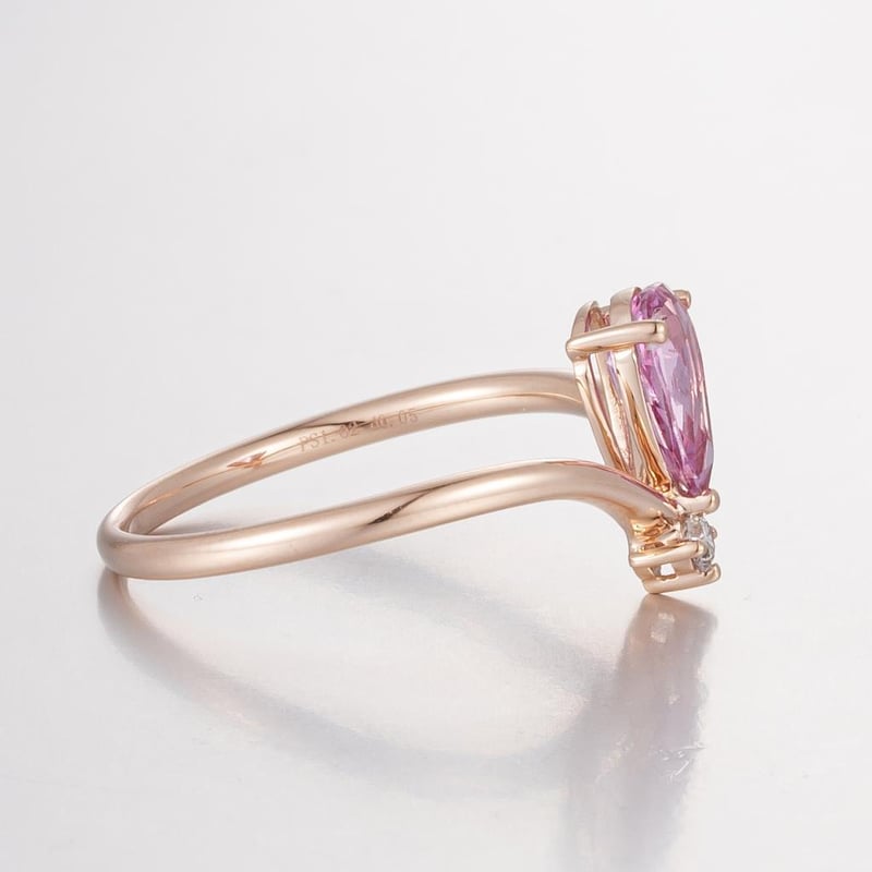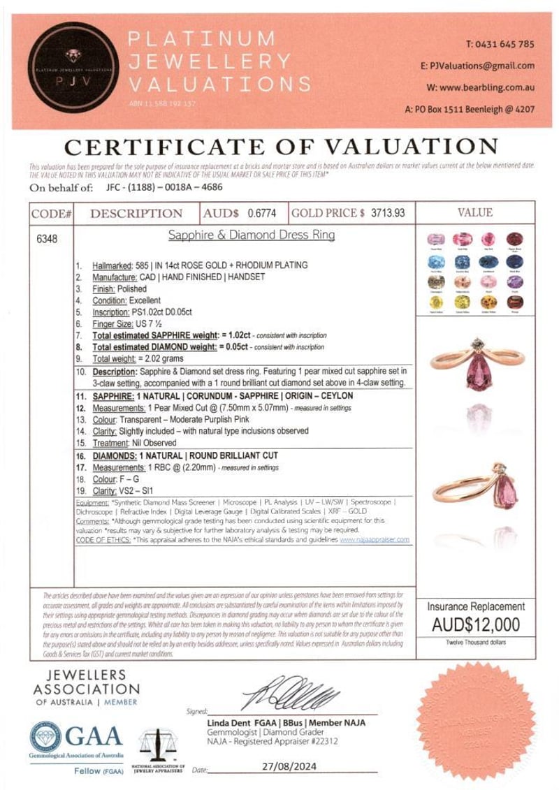 14CT ROSE GOLD PINK CEYLON SAPPHIRE AND DIAMOND DRESS RING Featuring Centre, One Pear Cut, Moderate Purplish Pink Ceylon Sapphire (1.02Ct, Slightly Included), Claw Set, With One Round Brilliant Cut Diamond (0.05Ct Tdw, F-G Colour, Vs2-Si1 Clarity), Claw Set. Ring Size O. Valuations Provided by an Independent Third-Party Professional Not Directly Associated With Lloyds Auctions at AUD $12000This valuation has been conducted by an independent third-party professional. The valuation amount is an assessment by the issuing valuer and does not reflect the auction value of the item. Any inquiries regarding the valuation should be directed to the issuing valuer (refer to contact details on the certificate), as Lloyds Auctions has no affiliation or influence over the valuation, the valuer, or the stated amount. Condition: Good - Refer Images 0584587+2240