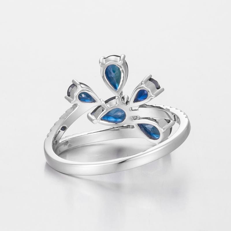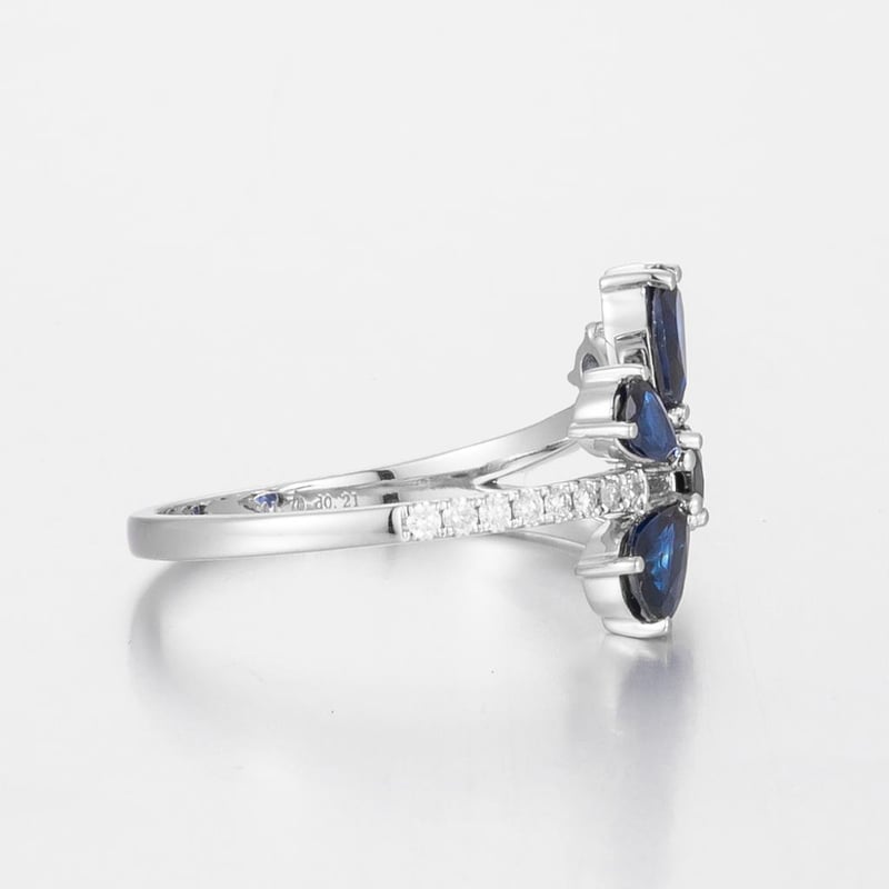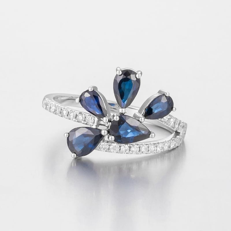Featuring Centre, 5 Pear Cut, Dark Blue Australian Sapphires (1.70Ct Tsw, Moderately Included), Claw Set, With 26 Round Brilliant Cut Diamonds (0.21Ct Tdw, F-G Colour, Vs1-Vs2 Clarity), Bead Set. Ring Size O.