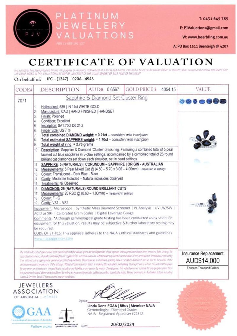 14CT WHITE GOLD AUSTRALIAN SAPPHIRE AND DIAMOND CLUSTER RING