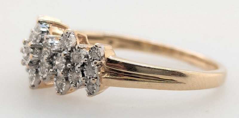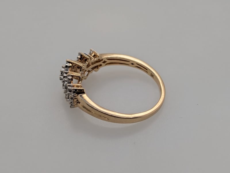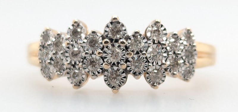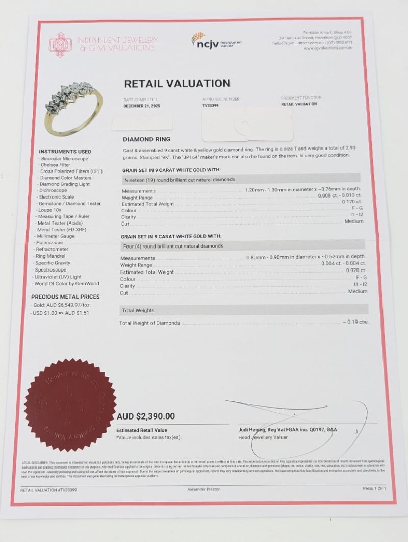 9K WHITE AND YELLOW GOLD DIAMOND RING Ring Features 23 Round Brilliant Cut Diamonds On Ring Front, Diamond Measurments Include:1.20Mm - 1.30Mm X 0.76Mm / 0.80Mm - 0.90Mm - 0.52Mm,Colour: F-GClarity: I1-I2Total Diamond Weight: 0.19Ct Total Item Weight: 2.90g Markings: Stamped: 9K Condition: Good - Refer To Images This valuation has been conducted by an independent third-party professional. The valuation amount is an assessment by the issuing valuer and does not reflect the auction value of the item. Any inquiries regarding the valuation should be directed to the issuing valuer (refer to contact details on the certificate), as Lloyds Auctions has no affiliation or influence over the valuation, the valuer, or the stated amount. Insurance Replacement Valuation Amount: $2,390.00 582958+6