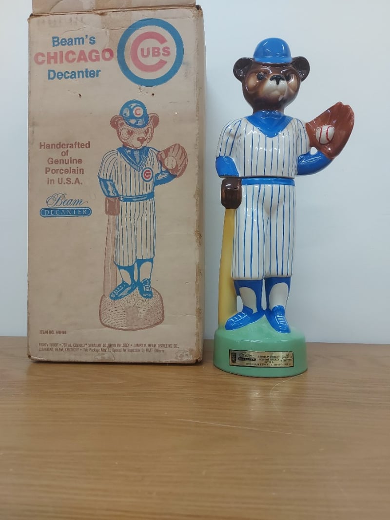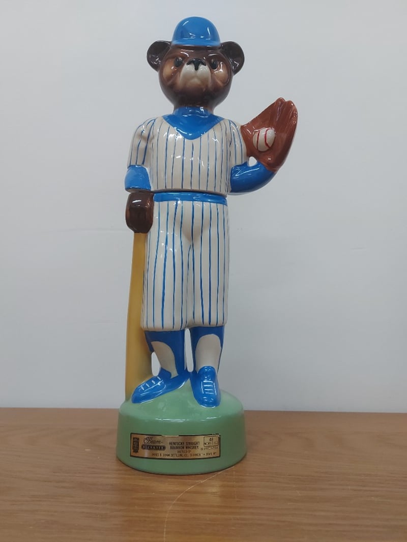 Beam'S Chicago Cubs Decanter Featuring A Hand-Crafted Porcelain Bear Mascot In Cubs Pinstriped Uniform, Blue Helmet, And Holding A Baseball Bat.