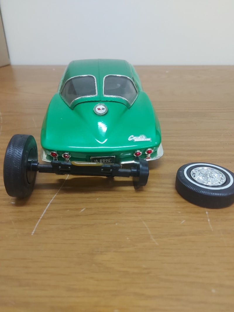 1963 Corvette Stingray Model In Striking Green With Opening Hood, Detailed Black Interior Featuring Steering Wheel, Chrome Color Wire Wheels With Whitewall Tires, Original Packaging Box, Wheels Not Attachted