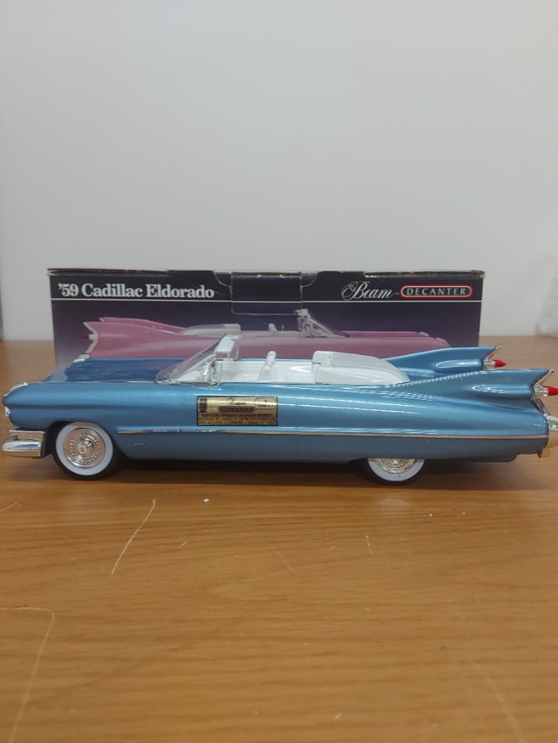 Decanter Featuring A 1959 Cadillac Eldorado Convertible In Striking Turquoise Blue Metallic Finish With White Interior.