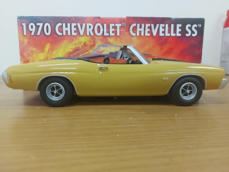 1970 CHEVROLET CHEVELLE SS MODEL CAR - YELLOW CONVERTIBLEItem Size: Height: 20cm, Width: 30cm, Depth: 20cm, Weight: 2KgModel Of A 1970 Chevrolet Chevelle Ss Convertible In Striking Yellow With Black Racing Stripes.Condition: Good - Refer To Images584569+77