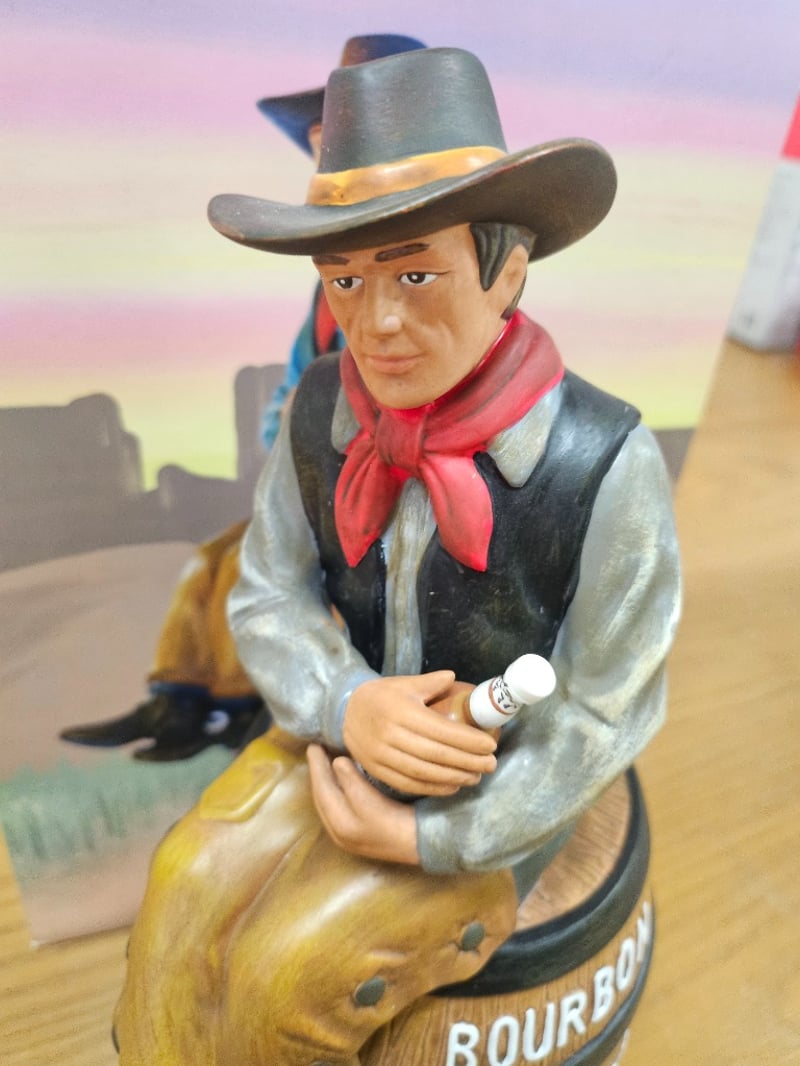 JIM BEAM BOURBON WHISKEY COWBOY DECANTER WITH ORIGINAL PACKAGINGItem Size: Height: 34cm, Width: 22cm, Depth: 17cm, Weight: 2KgCharming Ceramic Cowboy Figurine Decanter Featuring A Seated Perched Atop A Wooden Barrel Branded "Jim Beam Bourbon Whiskey." The Figure Wears A Black Wide-Brimmed Hat, Red Neckerchief, Grey Shirt, And Brown Leather Chaps, Holding A Small Bottle.Condition: Good - Refer To Images584569+82