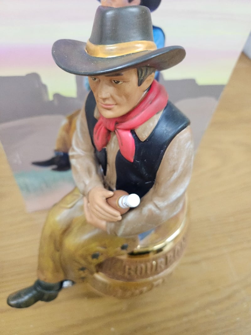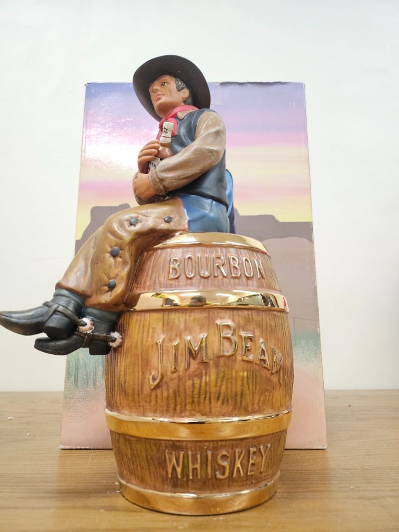 JIM BEAM BOURBON WHISKEY COWBOY DECANTER WITH ORIGINAL PACKAGINGItem Size: Height: 28cm, Width: 20cm, Depth: 15cmCharming Mid-Century Ceramic Decanter Featuring A Cowboy Figure Seated Atop Stacked Bourbon Barrels, Accompanied By Matching Cowboy Bust Figurine. Set Includes Original Decorative Box With Western Motifs, Barbed Wire Border, And Cactus Illustrations. Hand-Painted Details Include Pink Neckerchief, Blue Vest, Tan Leather Sleeves, And Black Hat With Gold Band. Barrel Bands Feature Brass-Tone Metal Accents. Original Stopper Present On Main Decanter.Condition: Good - Refer To Images584569+84