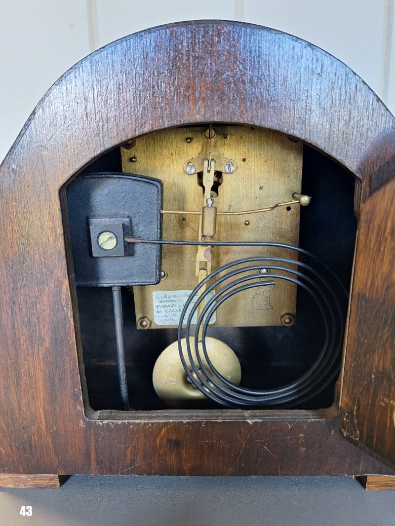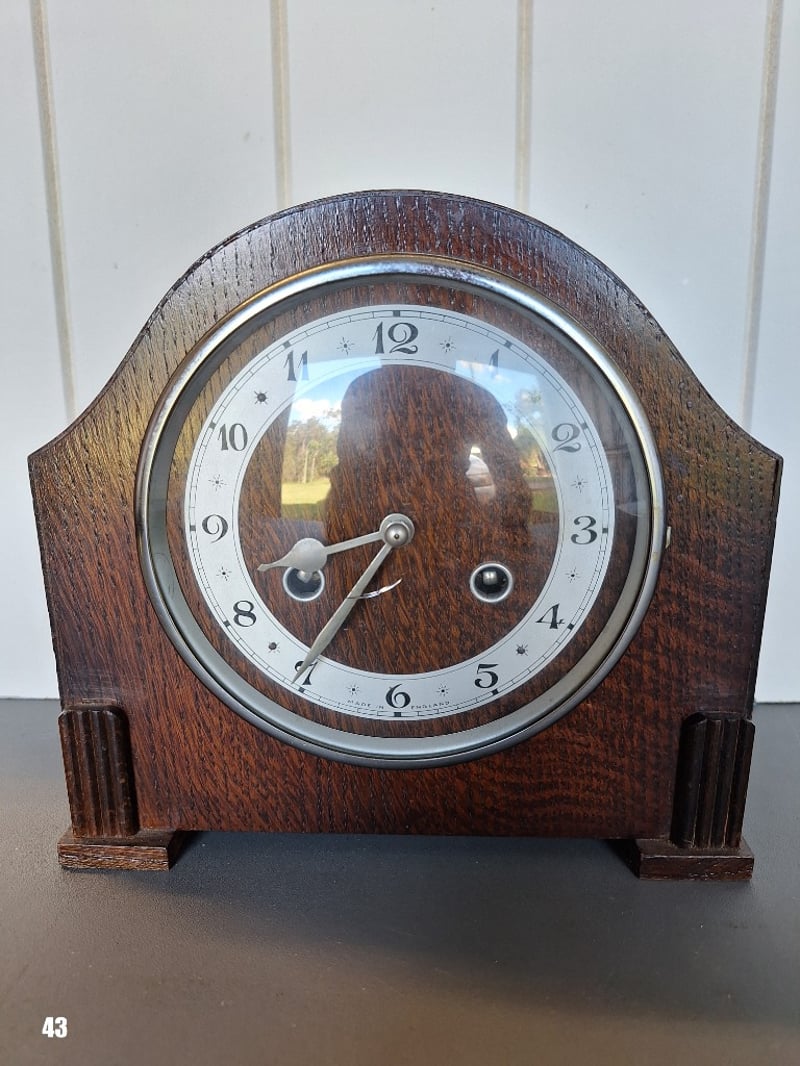VINTAGE PERIVALE - BRITANNIA CHIMING TIMBER MANTAL CLOCK C/ 1930'S.Item Size: Height: 22cm, Width: 23cm, Depth: 12cmMade In England. Key And Weight In Clock. Working Condition.584589+43